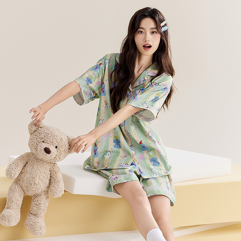 夏季A类纯棉柔软亲肤短袖睡衣女薄款卡通ins可爱开衫家居服可外穿