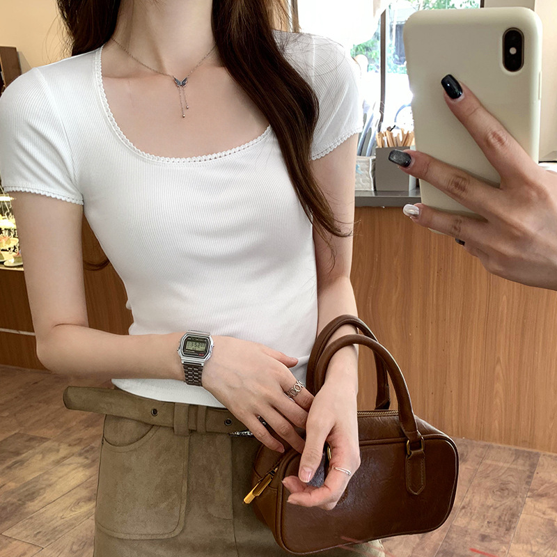韩系纯欲修身方领小花边螺纹短袖T恤女夏短款别致甜辣很仙的上衣