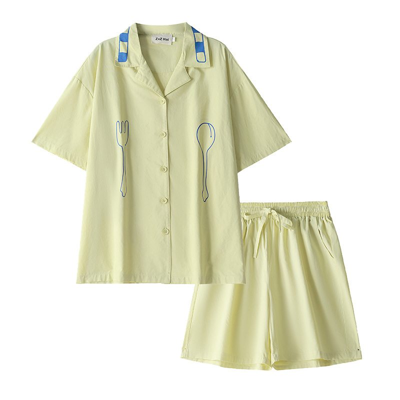 春夏款舒适柔软莫代尔家居服简约餐叉图案开衫翻领短袖套装可外穿