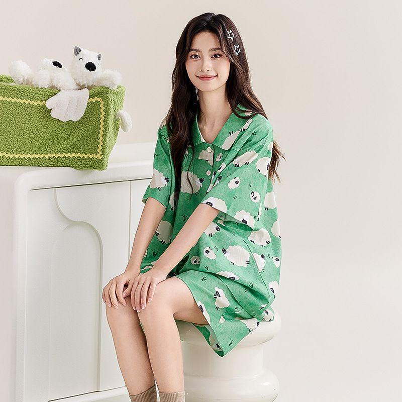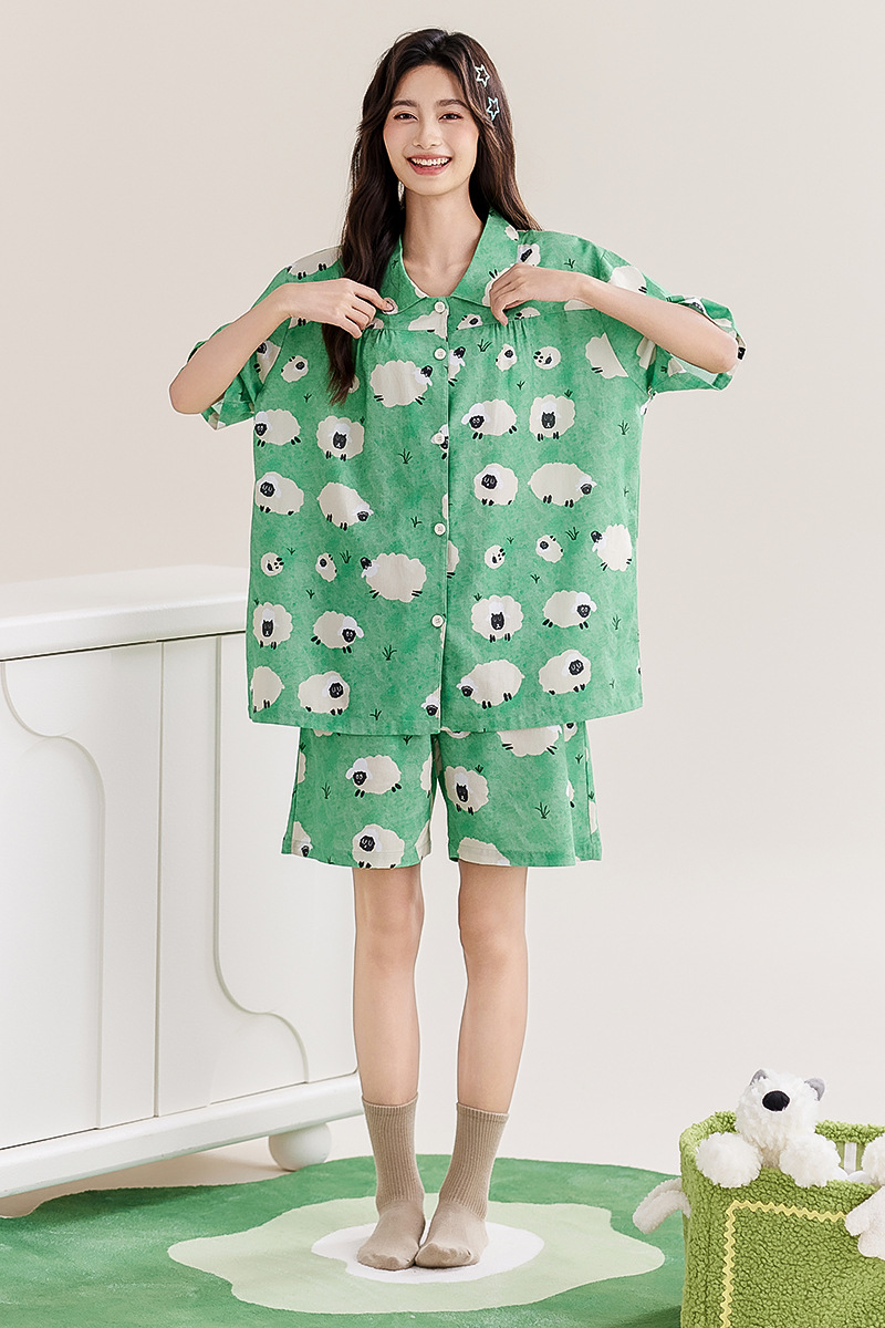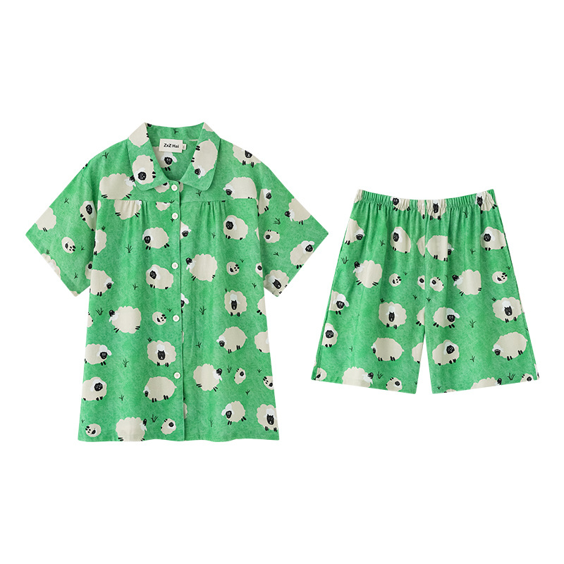 夏季绿色清新可爱草原小羊羔短袖开衫翻领睡衣套装动漫休闲家居服