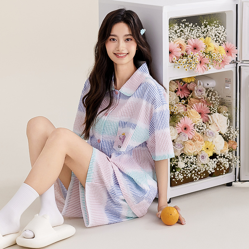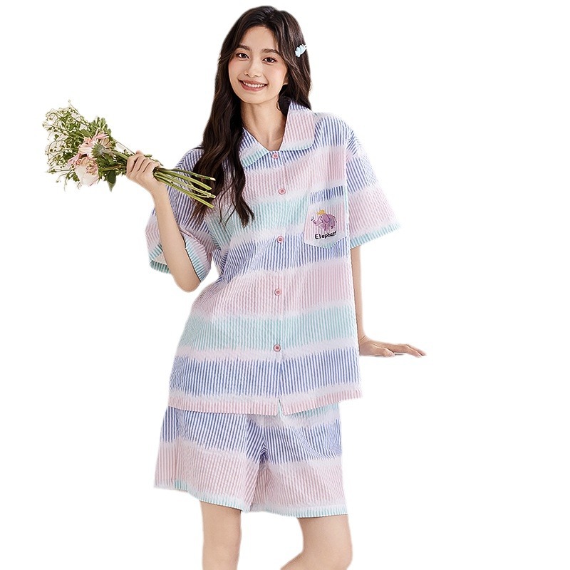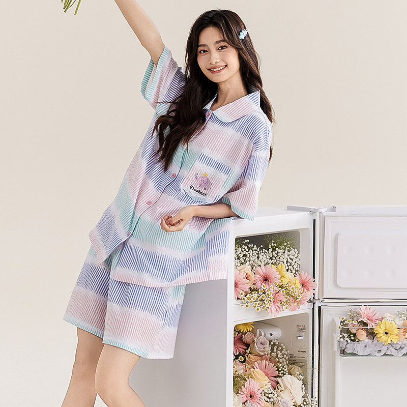 春夏韩系ins网红多巴胺风格彩色条纹睡衣纯棉甜美可爱少女家居服