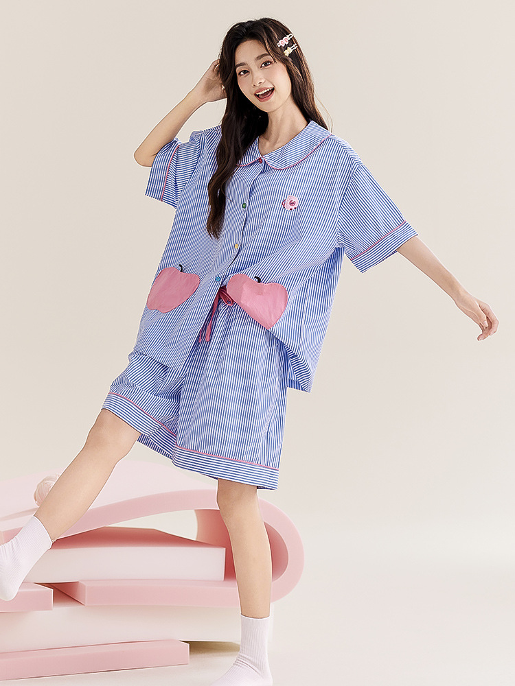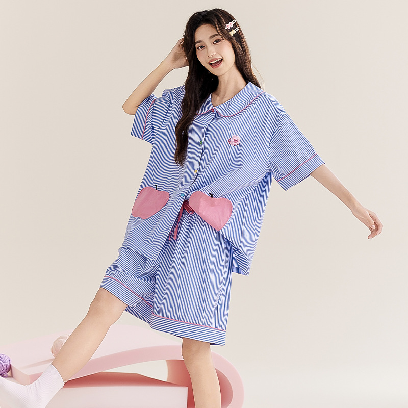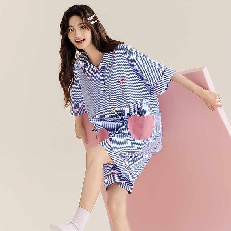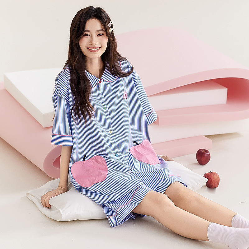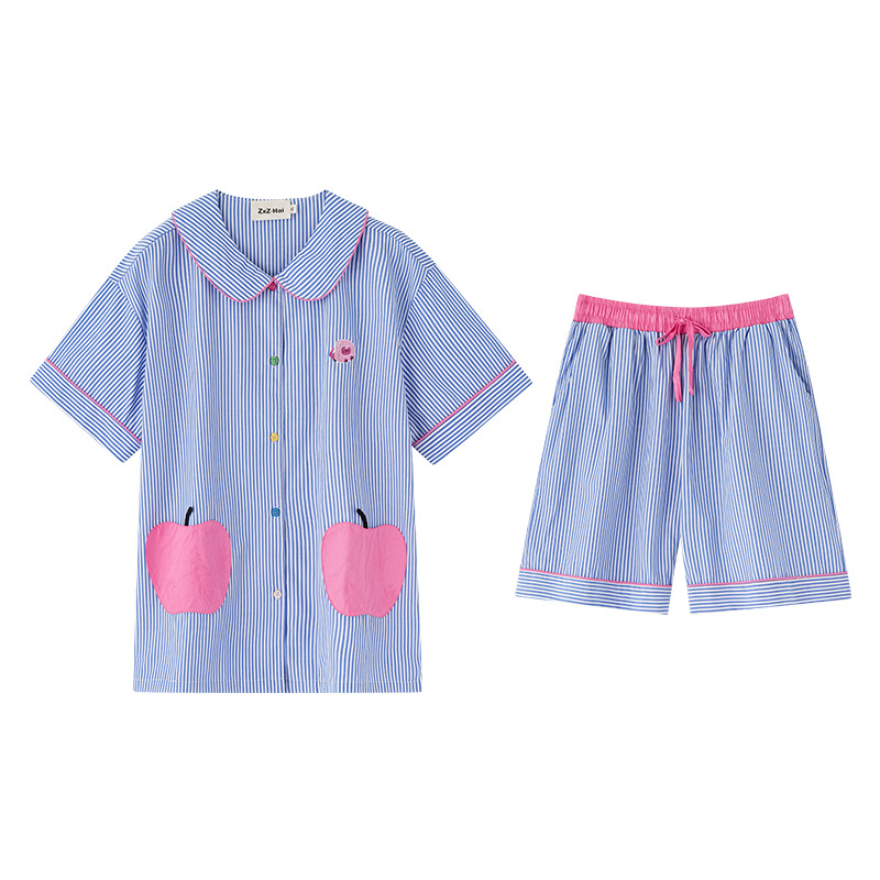 简约条纹开衫翻领睡衣两件套大苹果口袋可爱薄款休闲短袖家居服