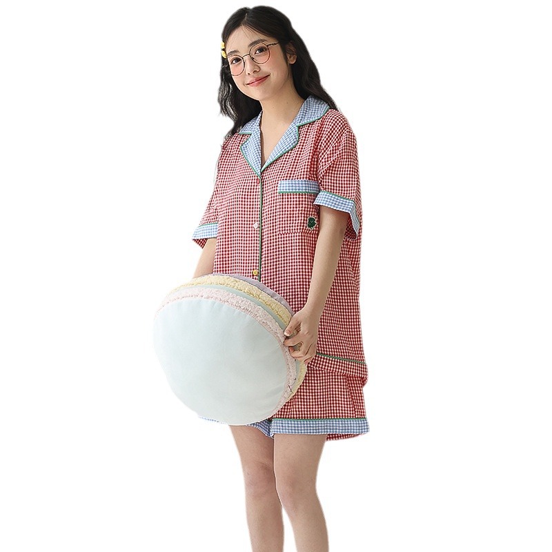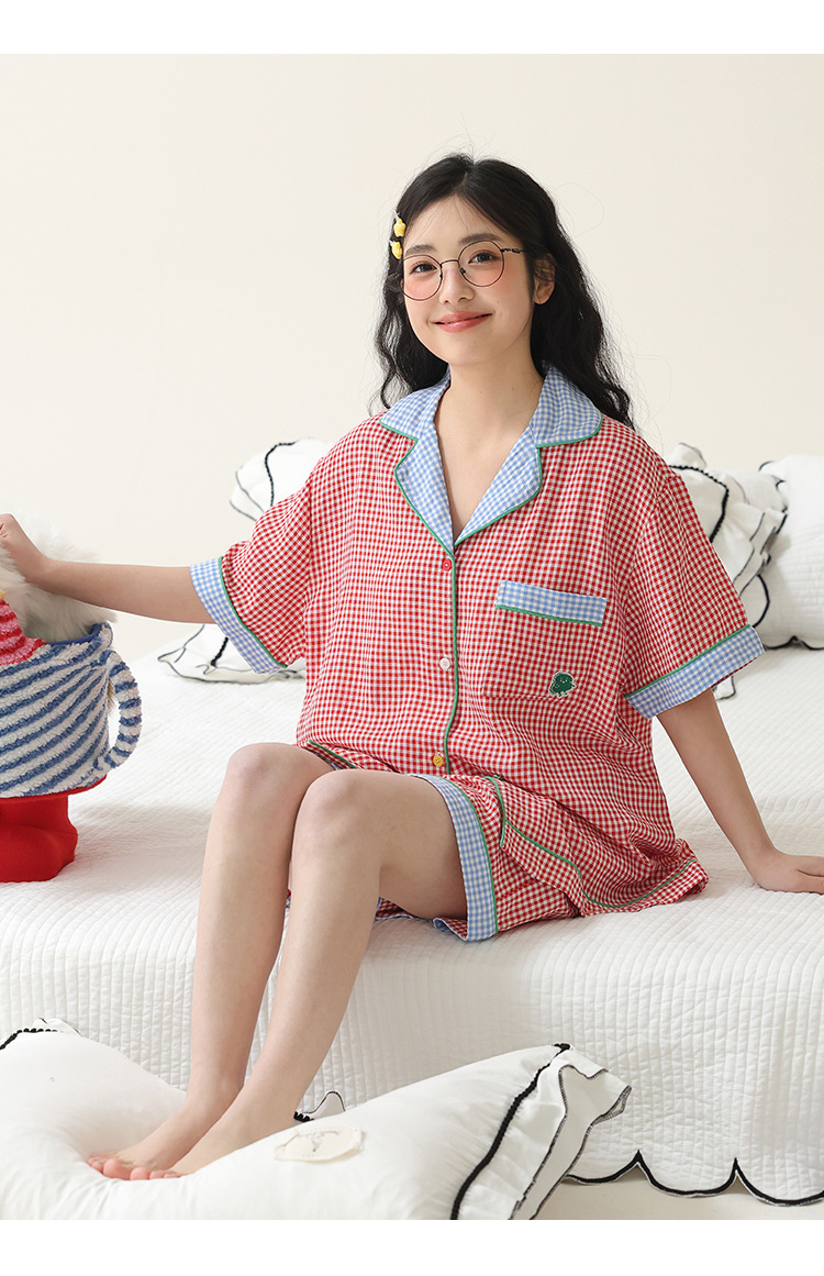 春夏季新款甜美可爱纯棉睡衣两件套红蓝撞色格纹休闲家居服可外穿