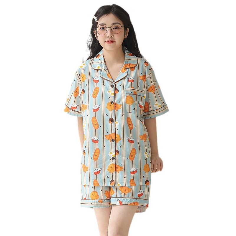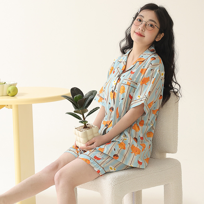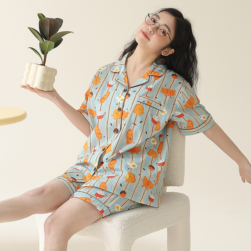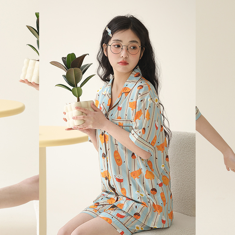 韩版早餐系列翻领睡衣女士短袖短裤卡通可爱ins风家居服套可外穿