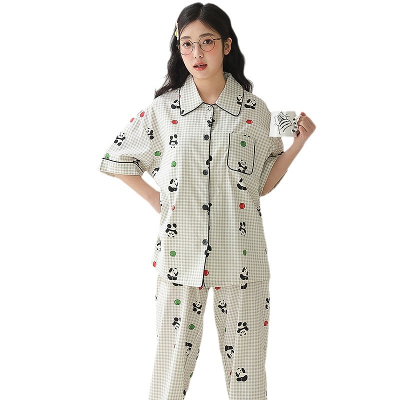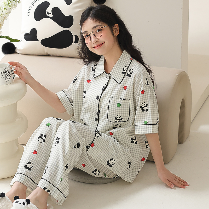 亲肤卡通熊猫苹果纯棉睡衣女士春夏新款短袖宽松家居服套装可外穿