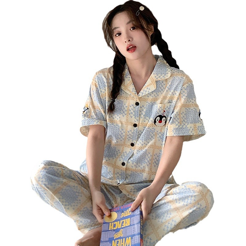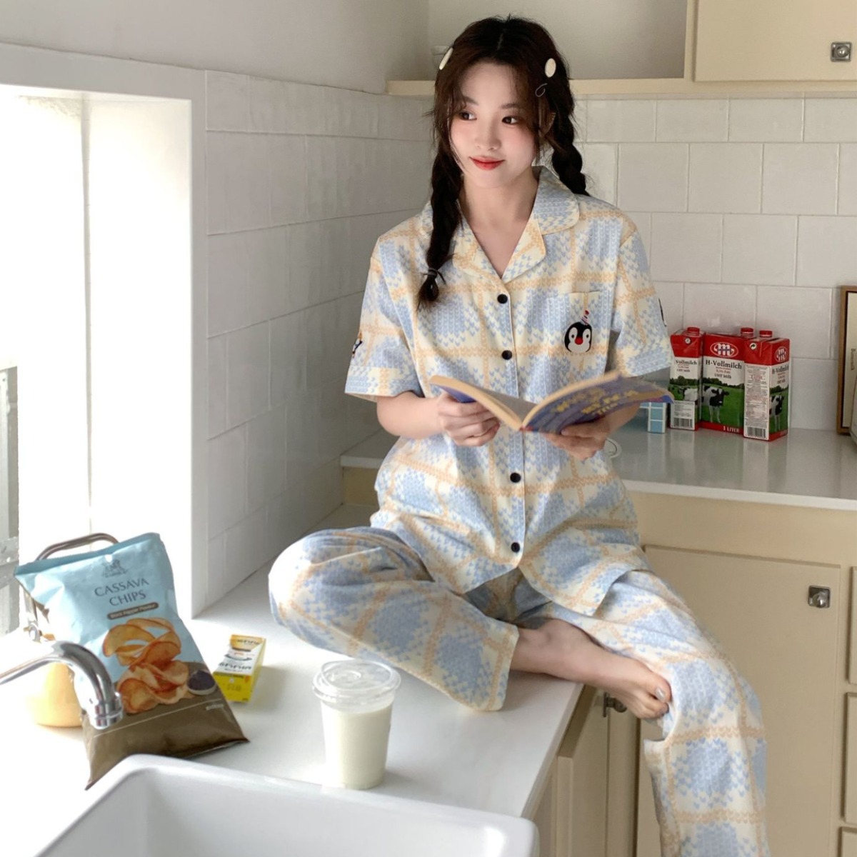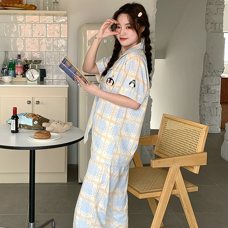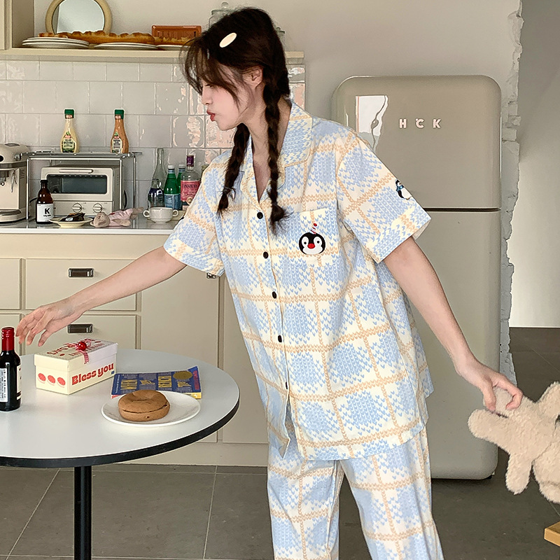 韩版企鹅刺绣口袋短袖长裤纯棉睡衣两件套简约清新翻领家居服套装