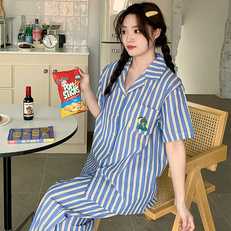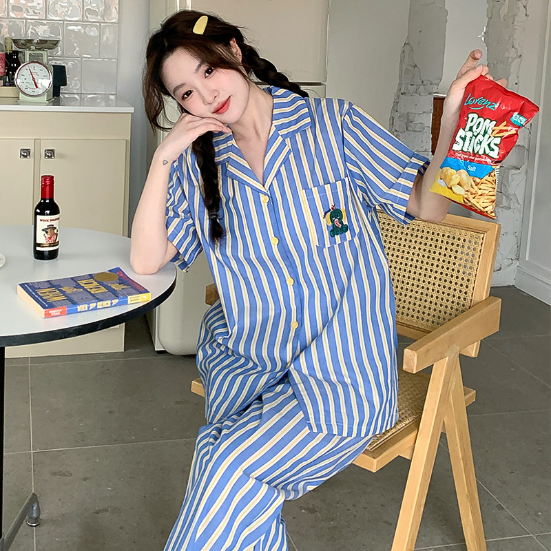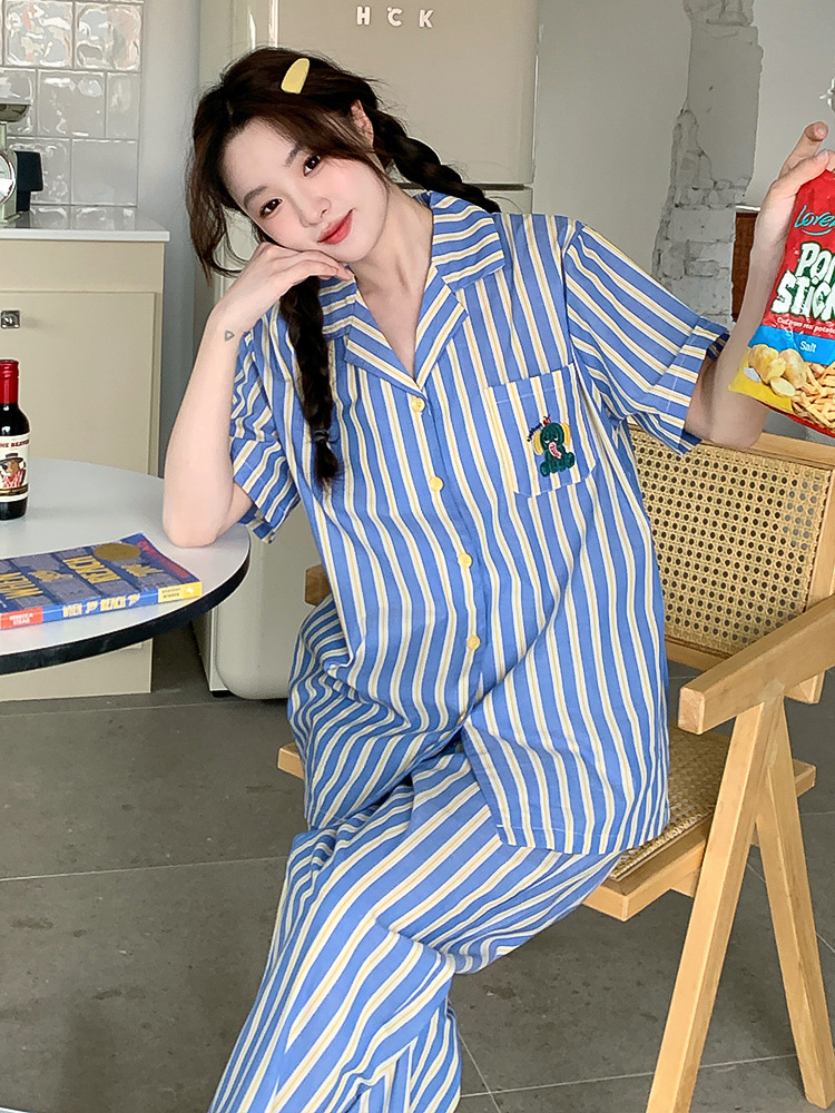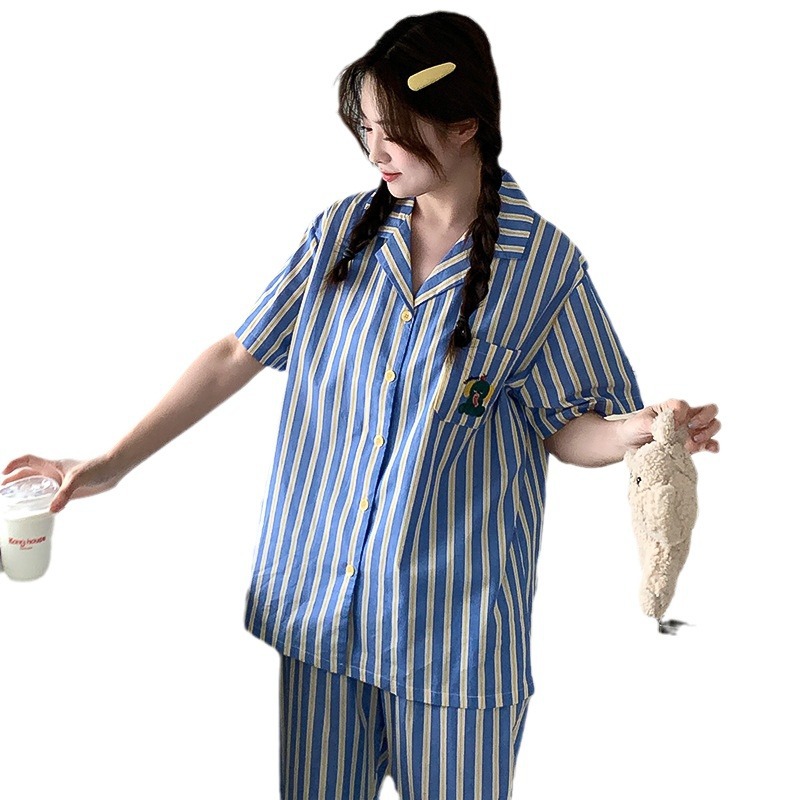 纯棉ins风休闲短袖家居服两件套大象蓝黄条纹翻领开衫睡衣可外穿