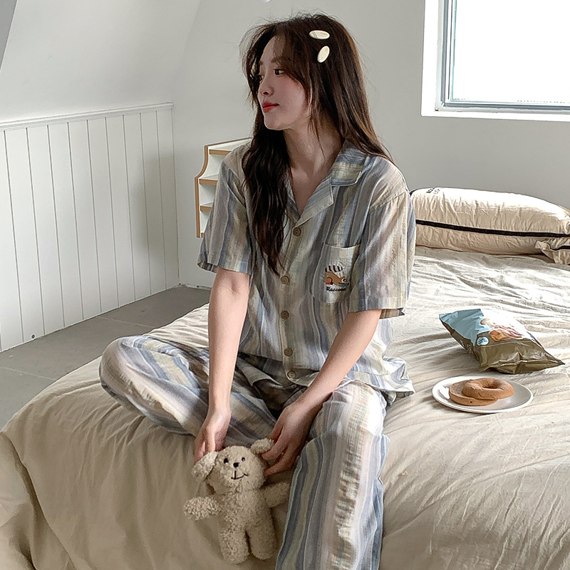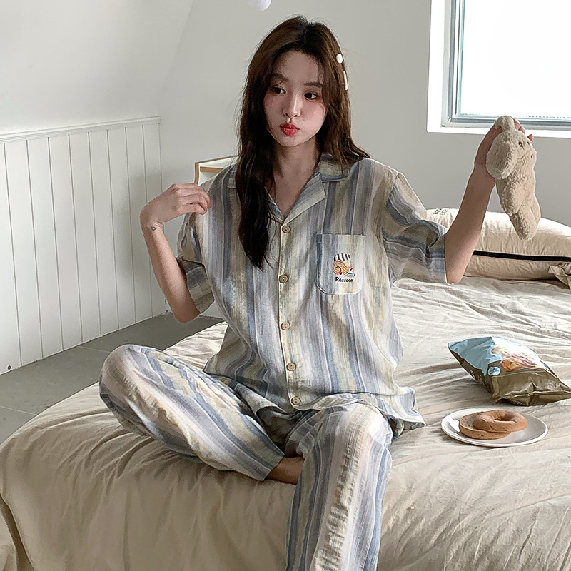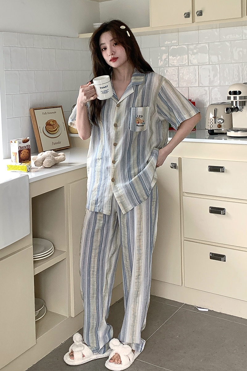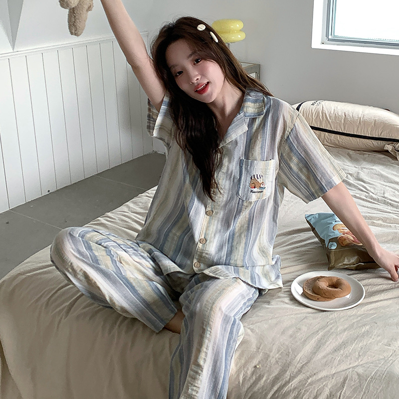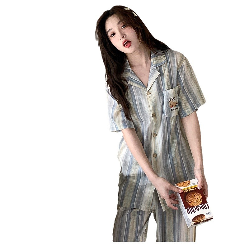 春夏季松鼠刺绣口袋条纹短袖长裤套装ins风清冷感家居服情侣睡衣