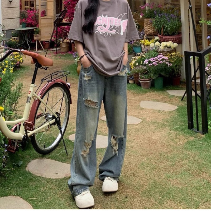 复古阔腿破洞牛仔裤女春秋新款大码胖mm宽松显瘦直筒拖地裤子