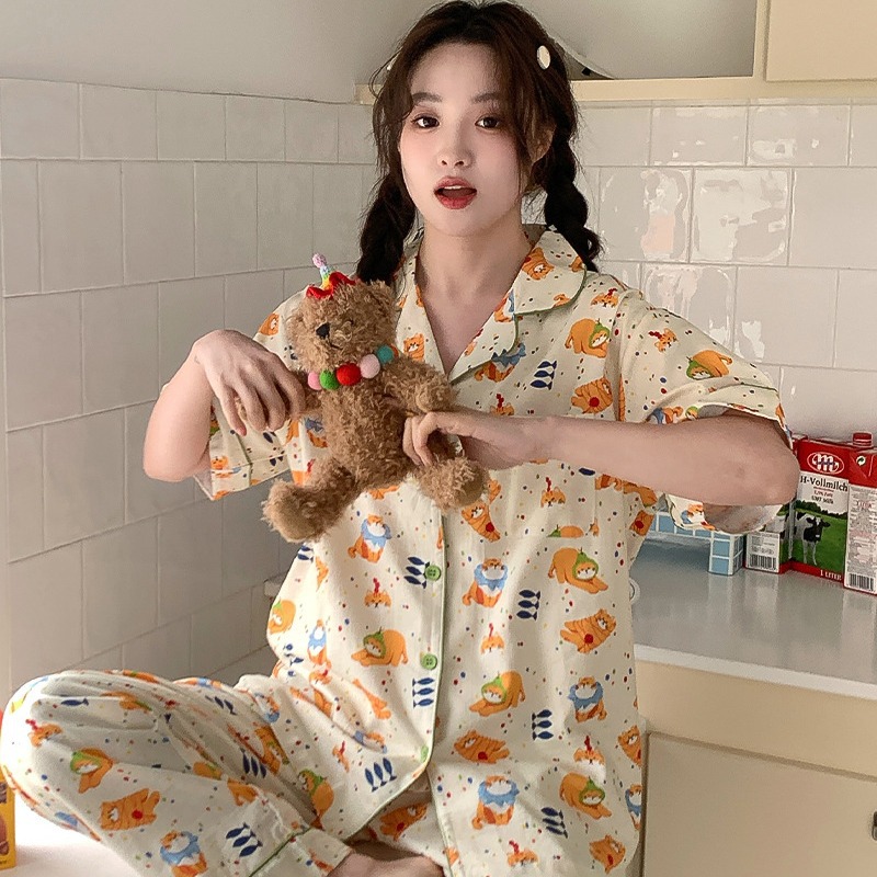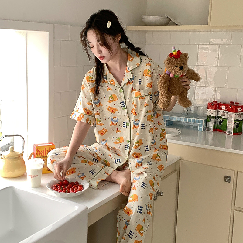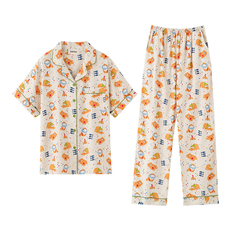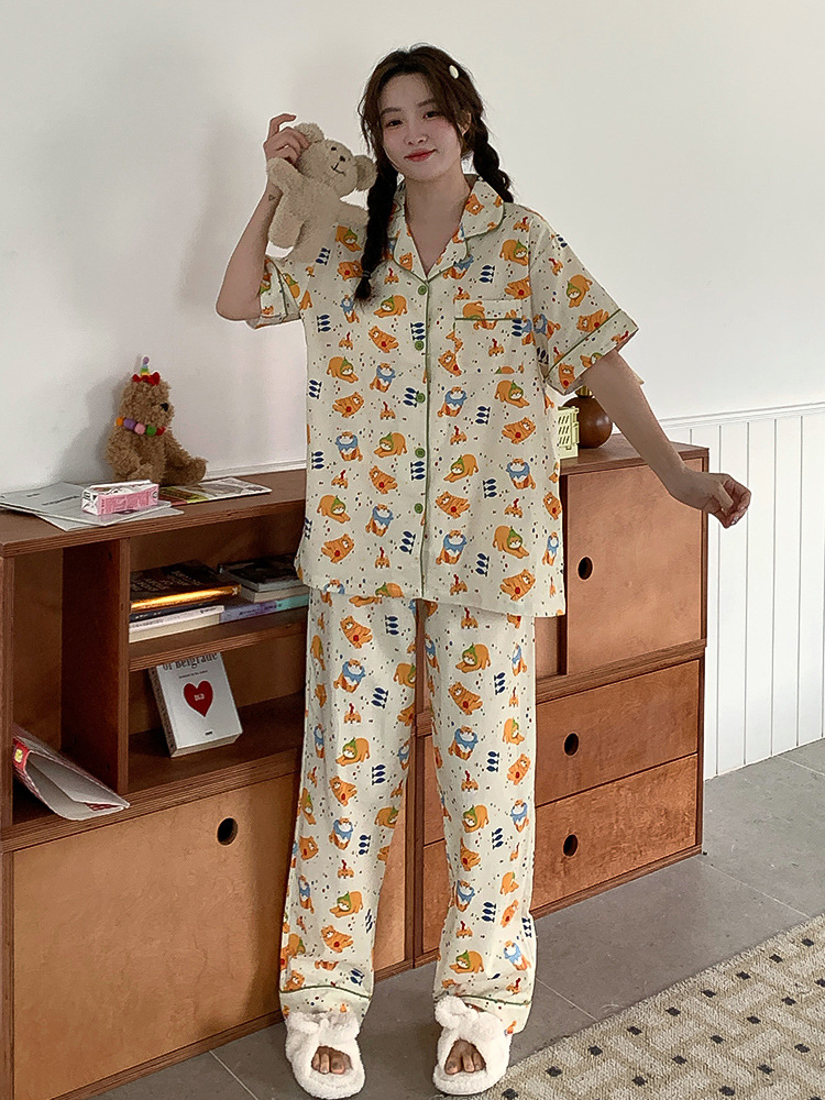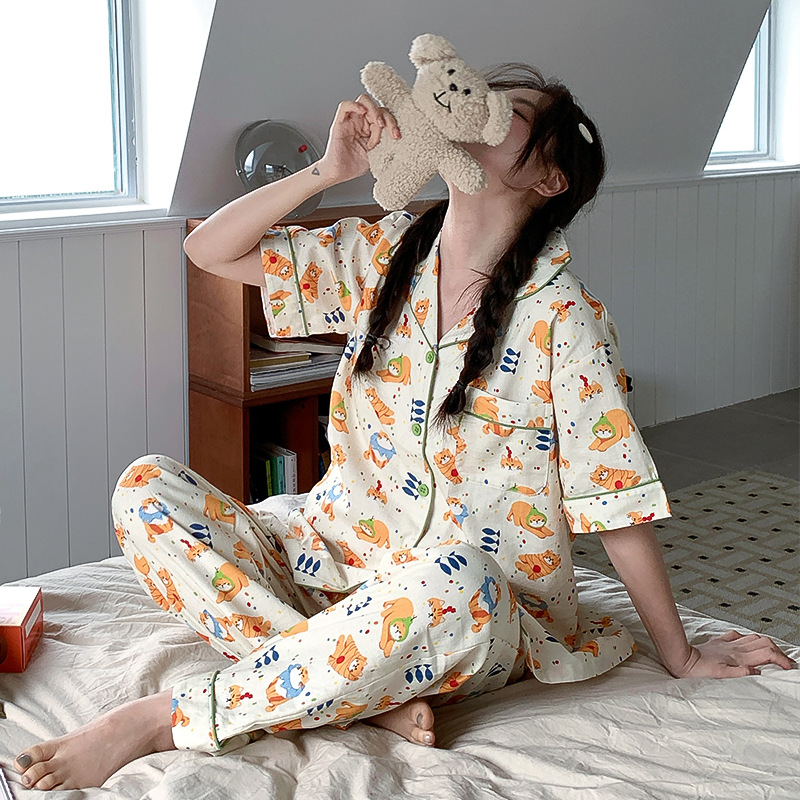 春夏新款卡通猫猫世界短袖长裤翻领休闲家居服甜美可爱睡衣两件套