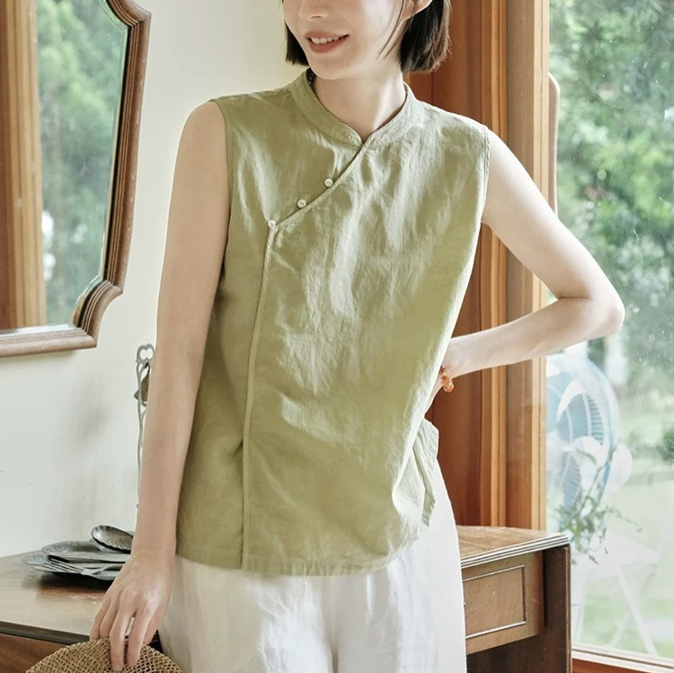 环保染薄荷曼波 暗纹提花新中式斜襟上衣背心无袖T可然恬宛