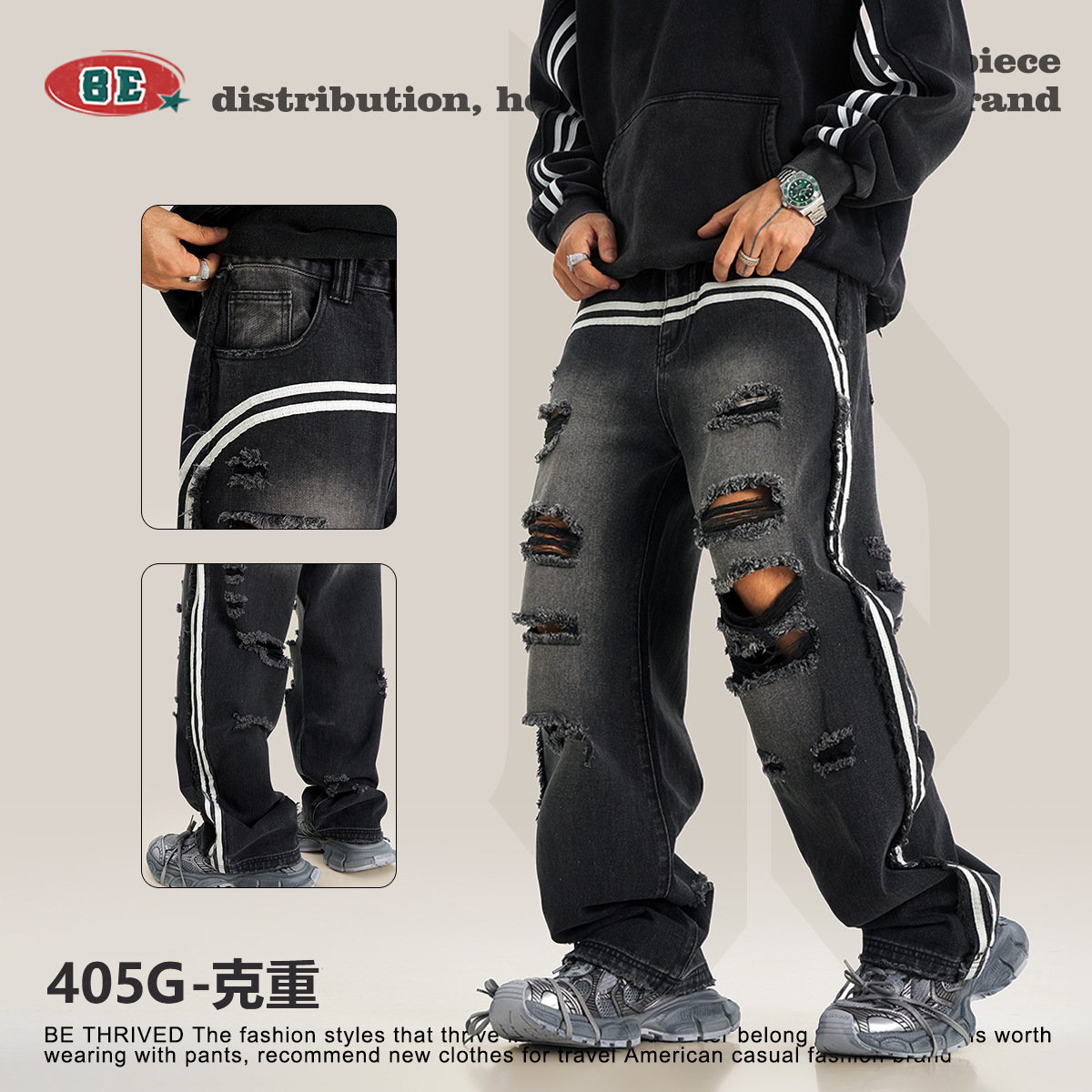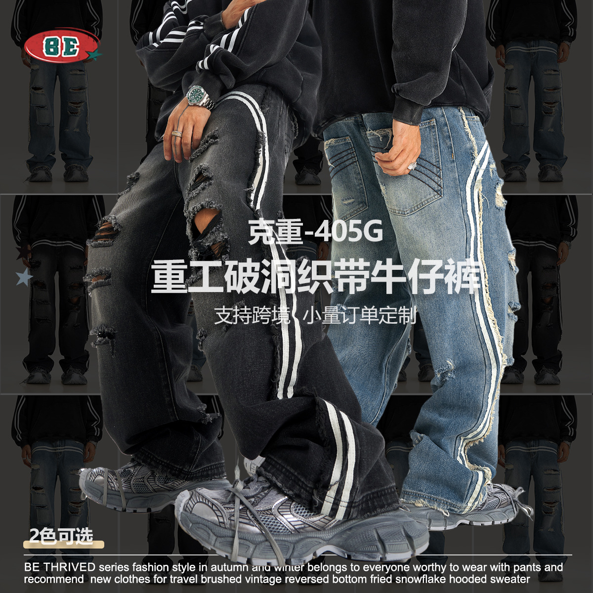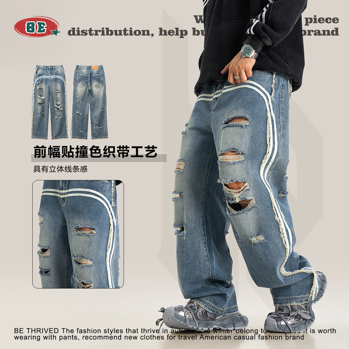 BE男装四季款美式复古潮流高街做旧痞帅宽松阔腿拖地牛仔裤男