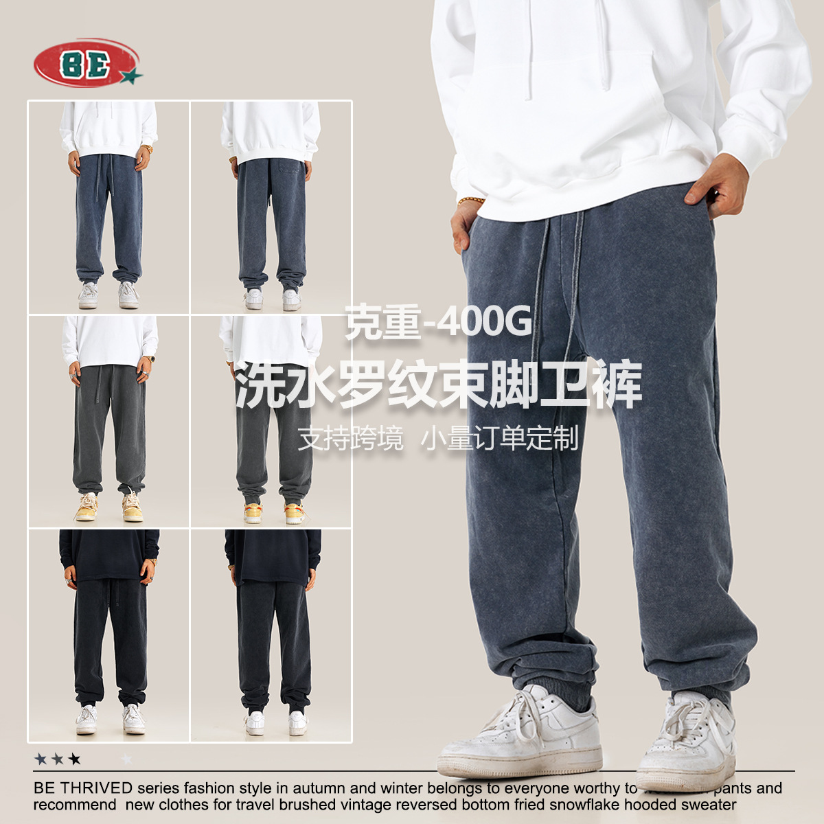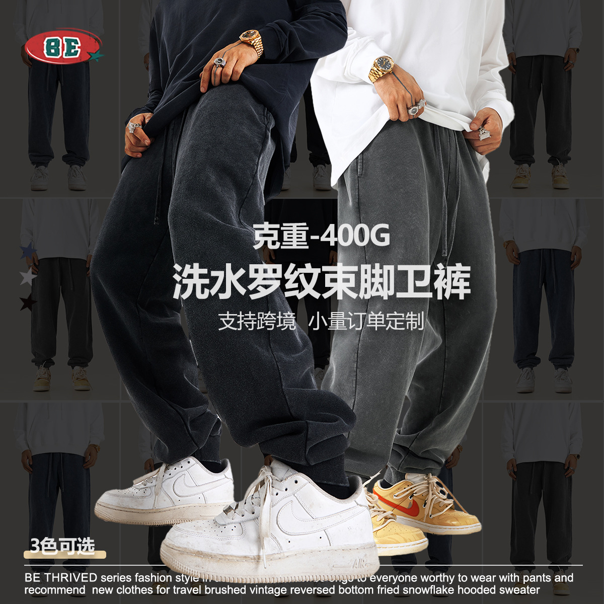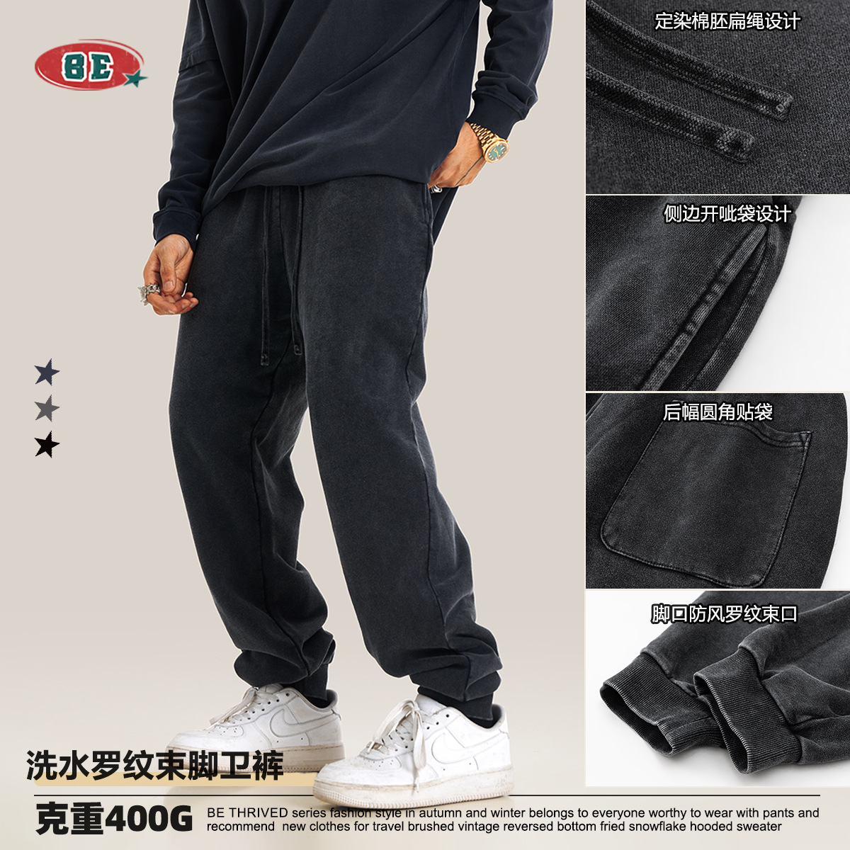 BE男装|秋季街头潮牌做旧大码宽松束脚长裤复古ins水洗卫裤男