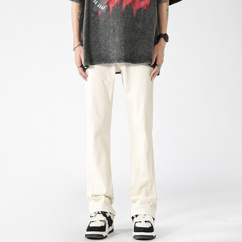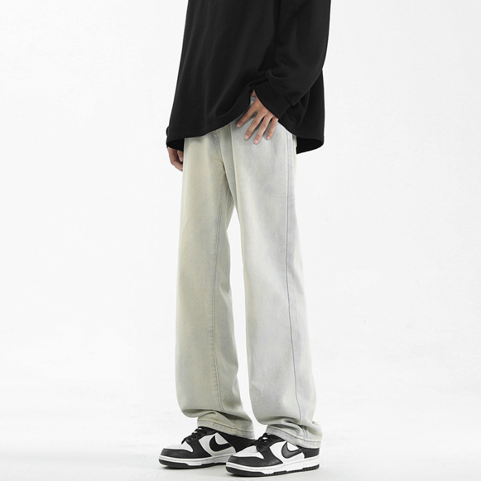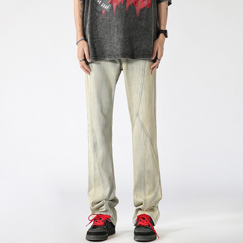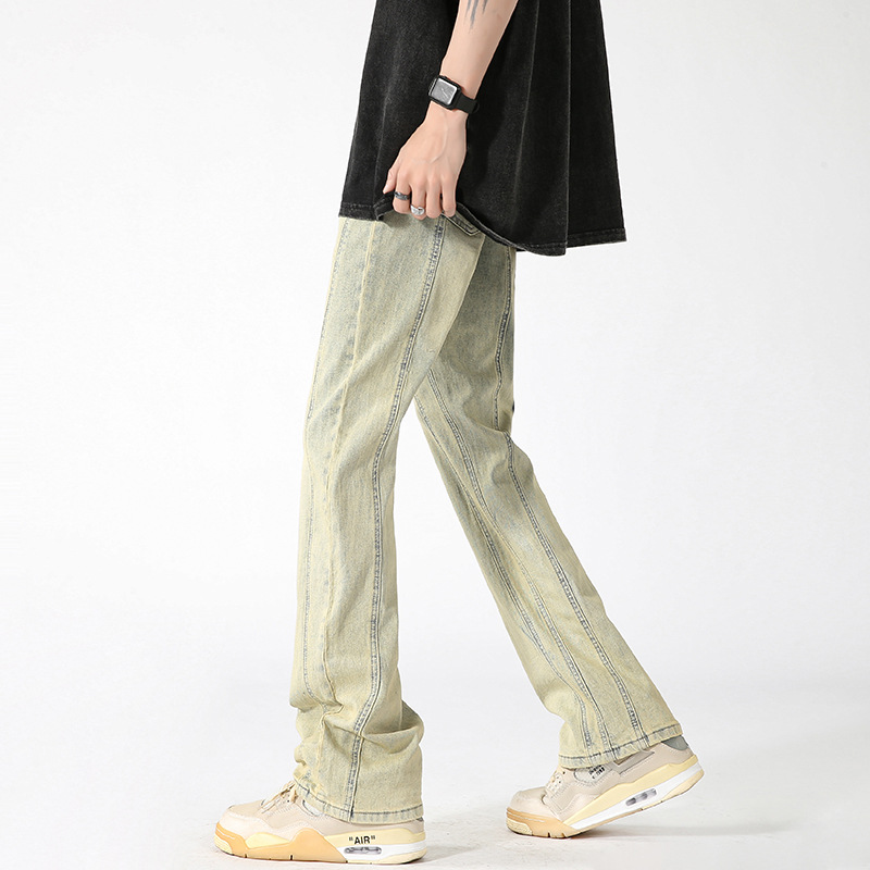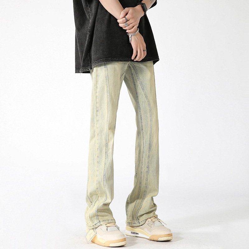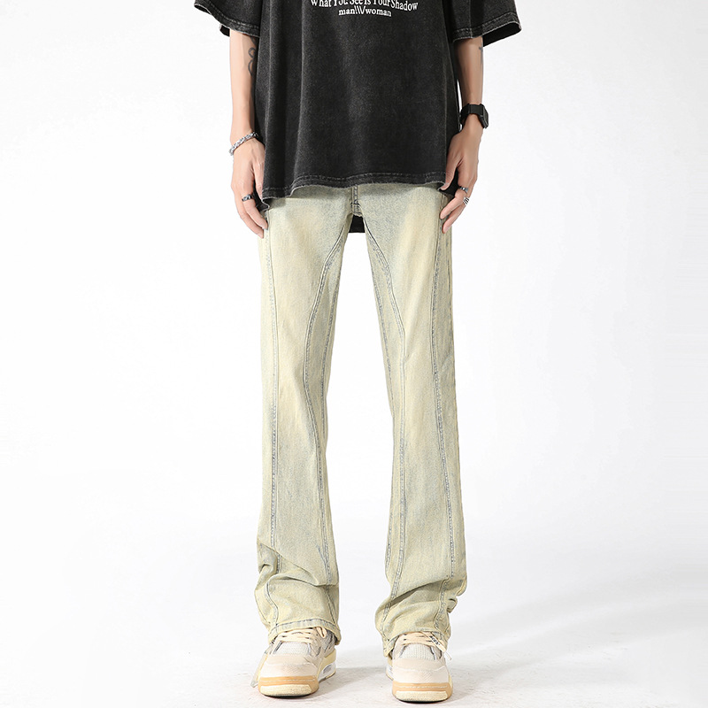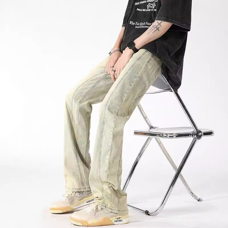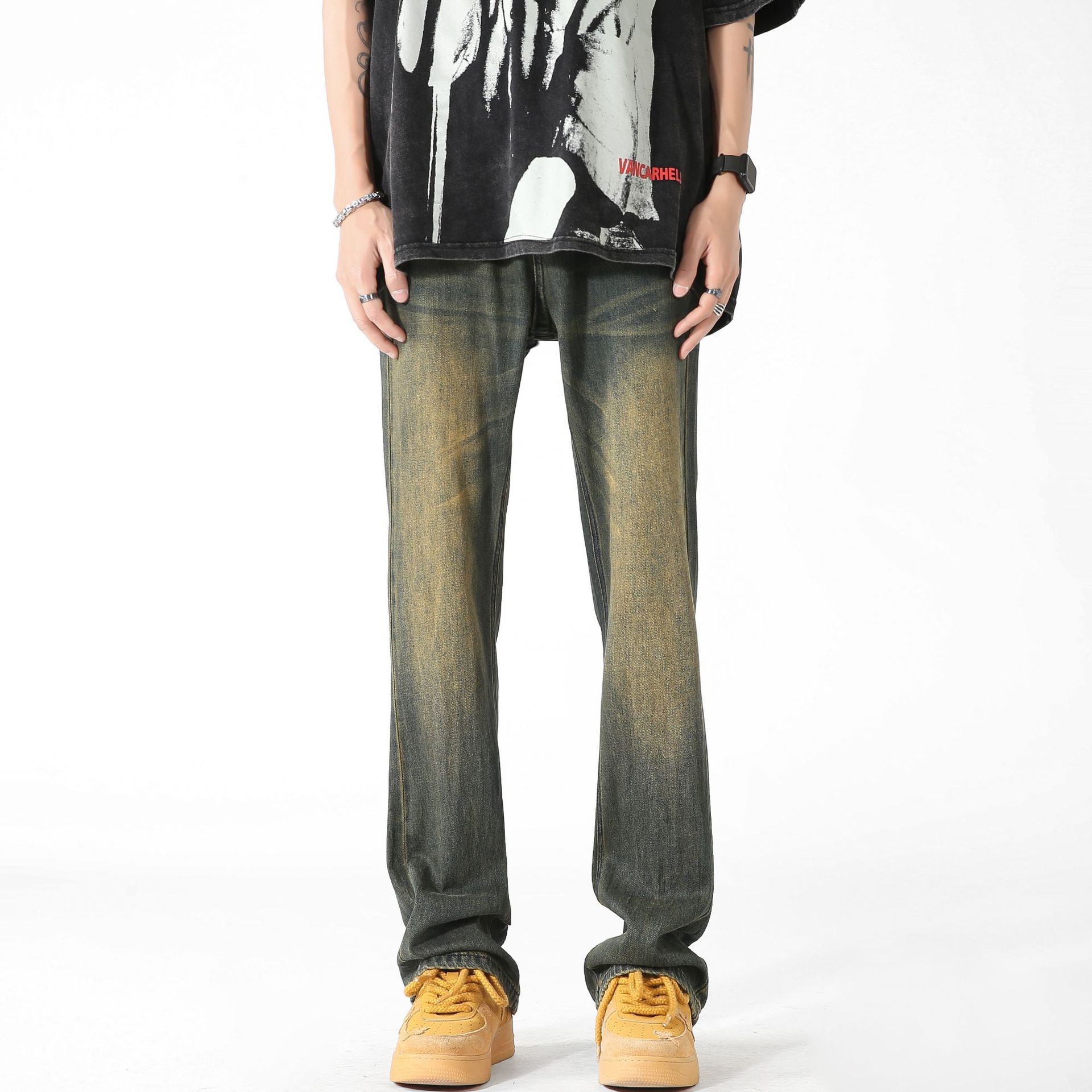 尚谷男装 美式黄泥色拼接牛仔裤男微喇广州潮牌宽松直筒显高长裤