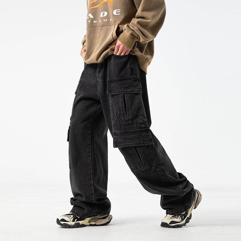 原创多口袋设计感牛仔裤男装秋季款洗水做旧潮牌宽松日系牛仔长裤