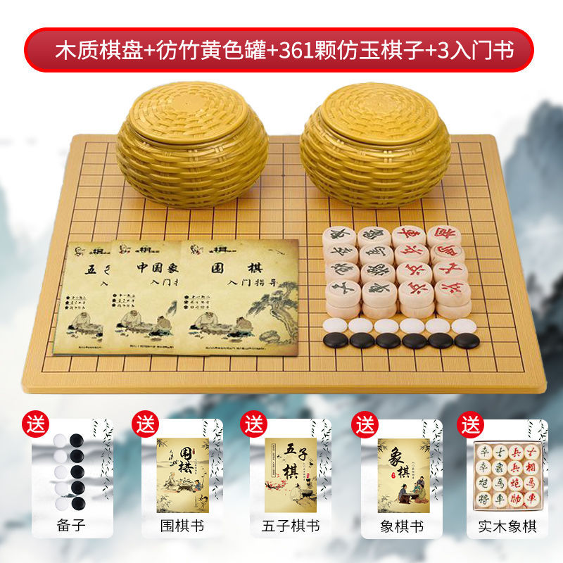 彷竹黄色罐-【木质棋盘】+实木象棋-【老师推荐】361仿玉子+入门书套餐