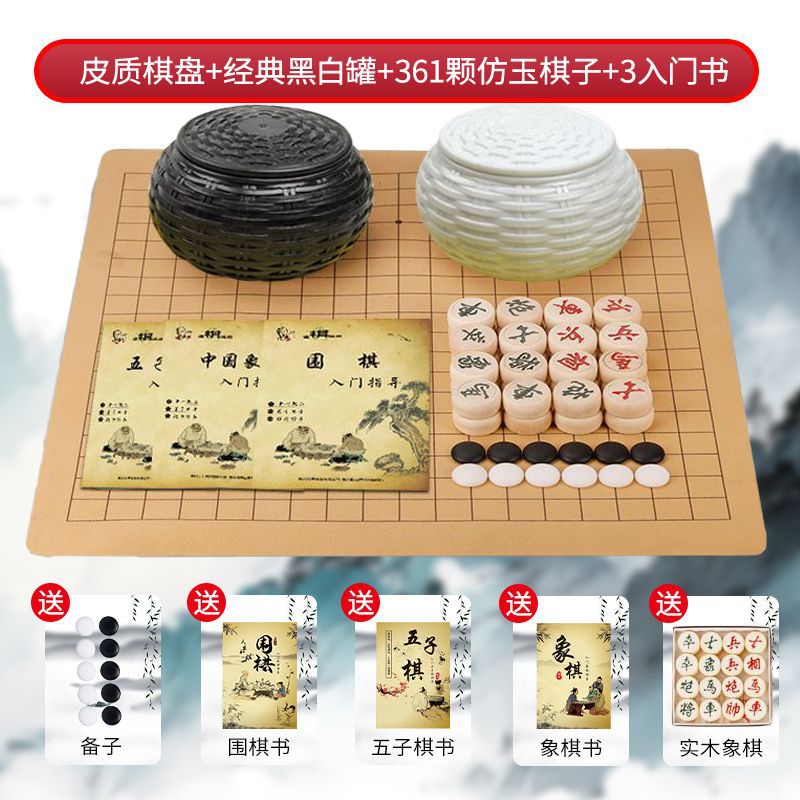 经典黑白罐-【皮革棋盘】+实木象棋-【老师推荐】361仿玉子+入门书套餐
