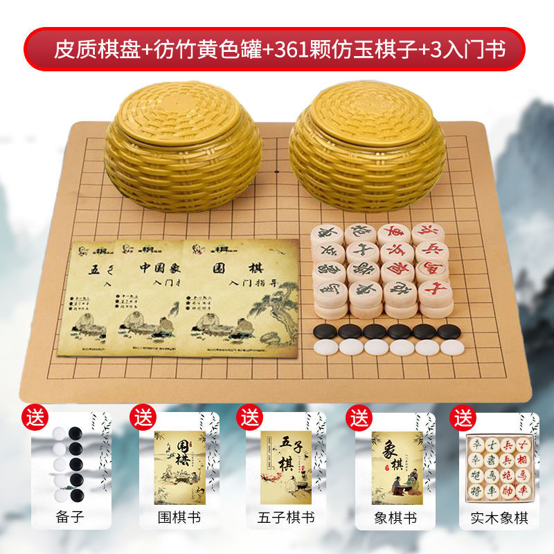 彷竹黄色罐-【皮革棋盘】+实木象棋-【老师推荐】361仿玉子+入门书套餐