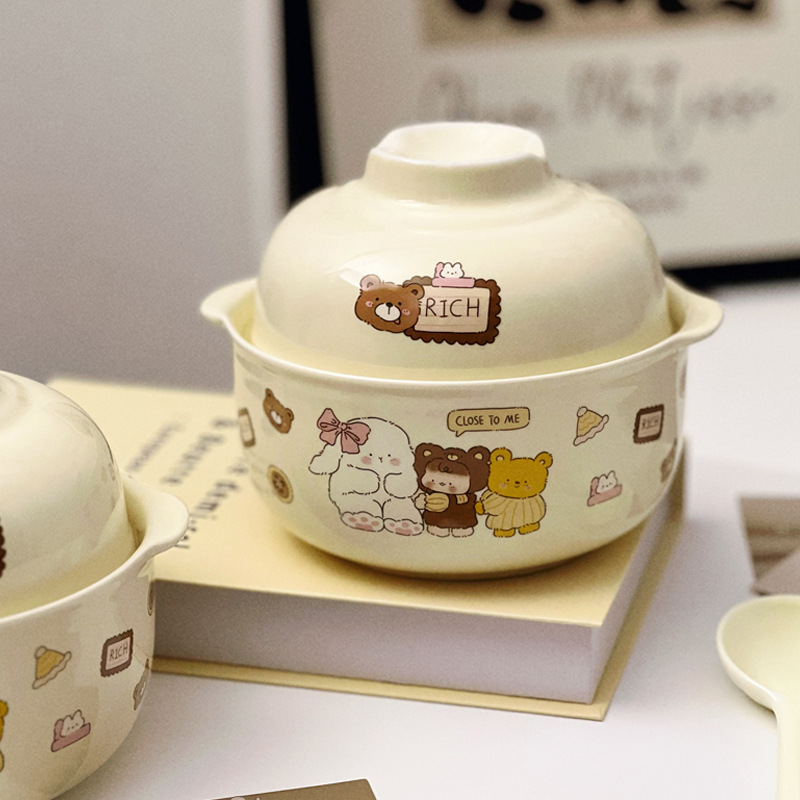 奶陶瓷水果沙拉碗双耳带盖汤碗学生宿舍可爱泡面碗一人食餐具