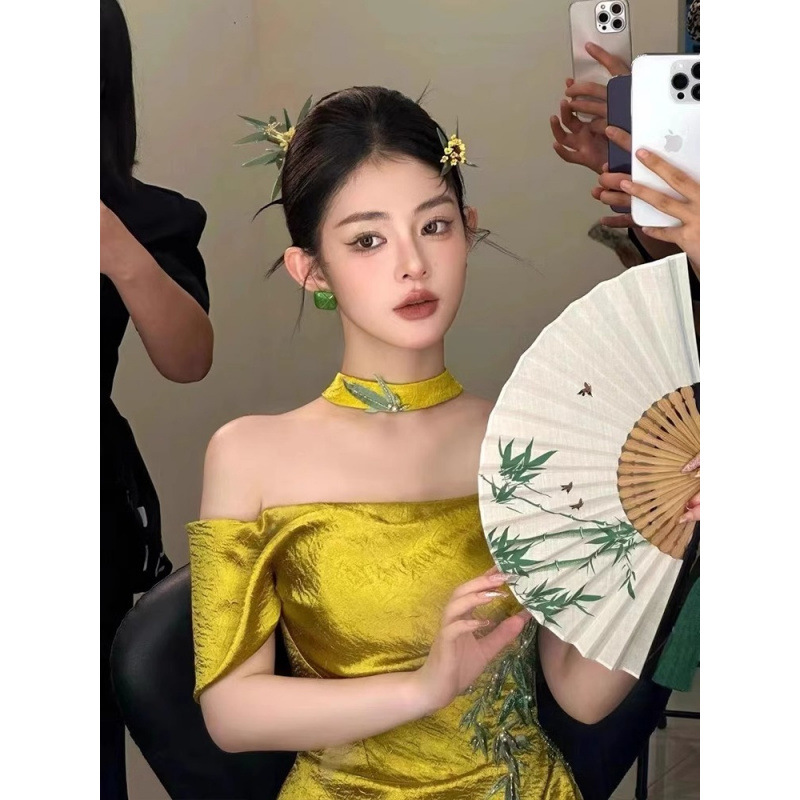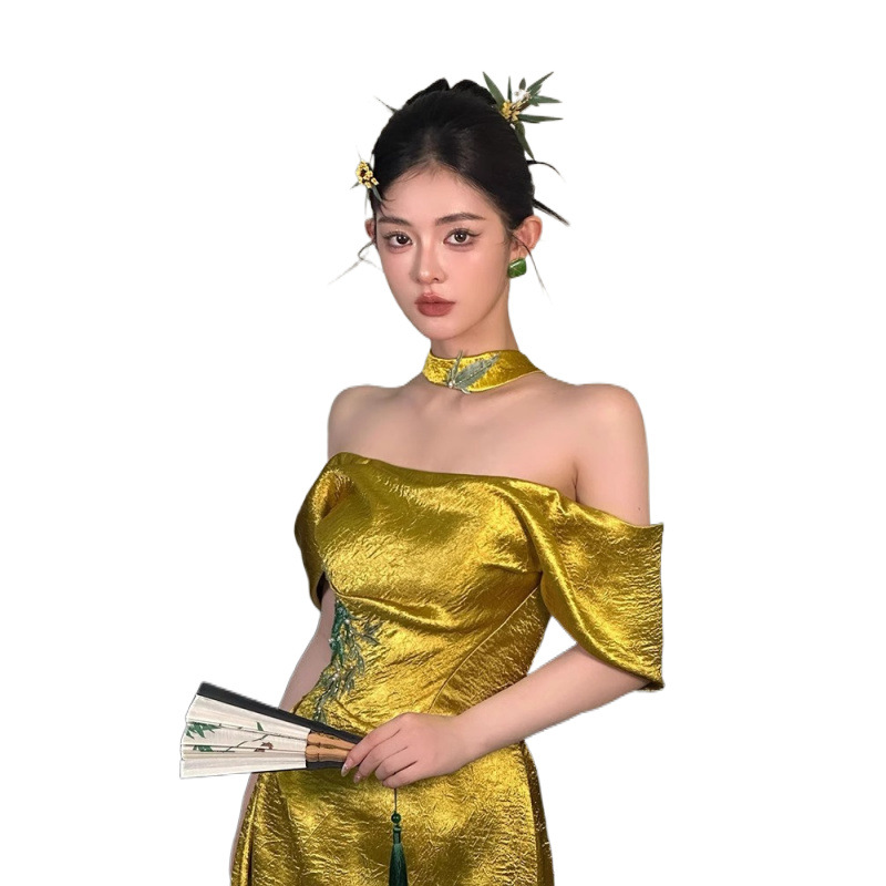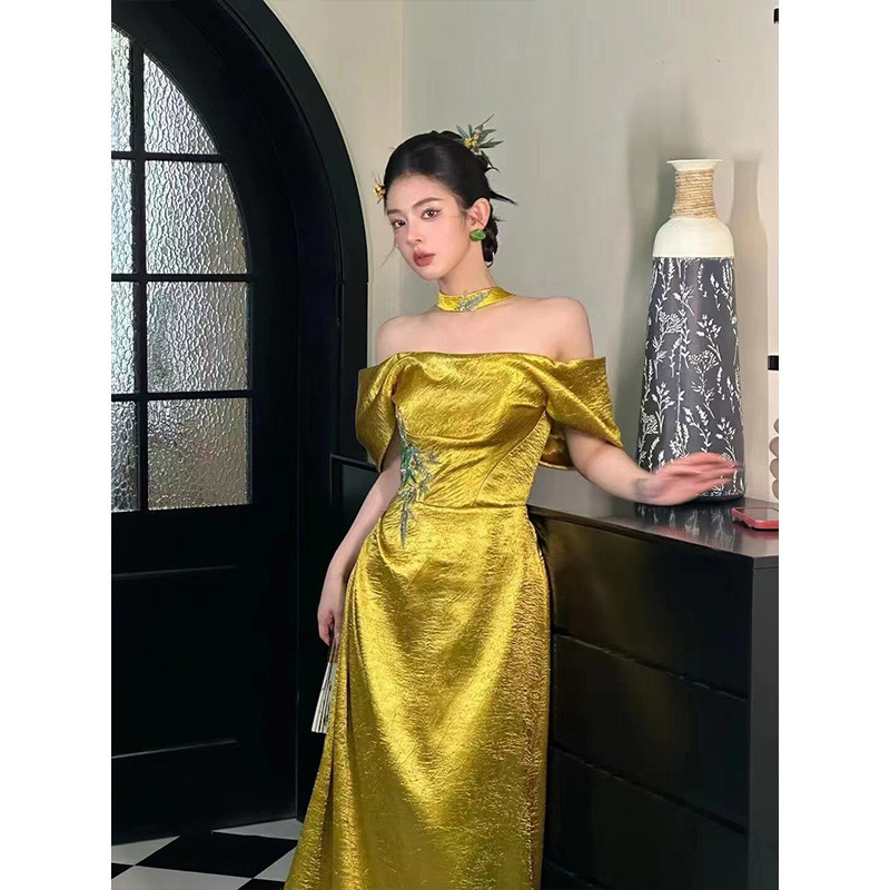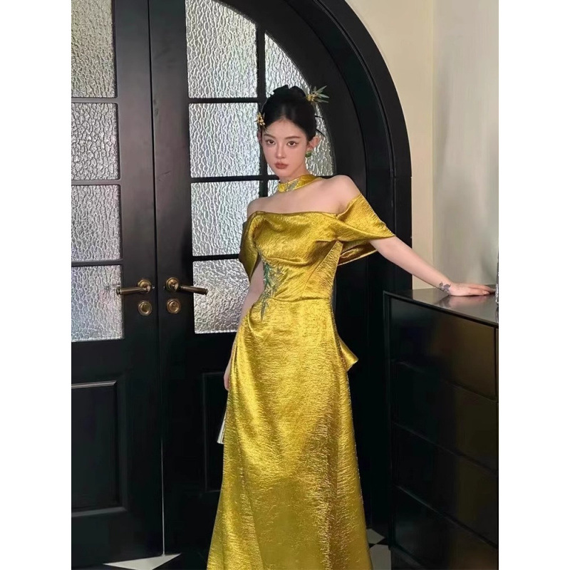 新中式晨袍女新款抹胸新娘订婚礼裙敬酒服一字肩主持人晚礼服