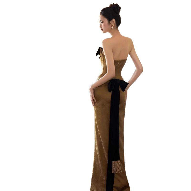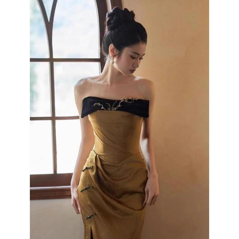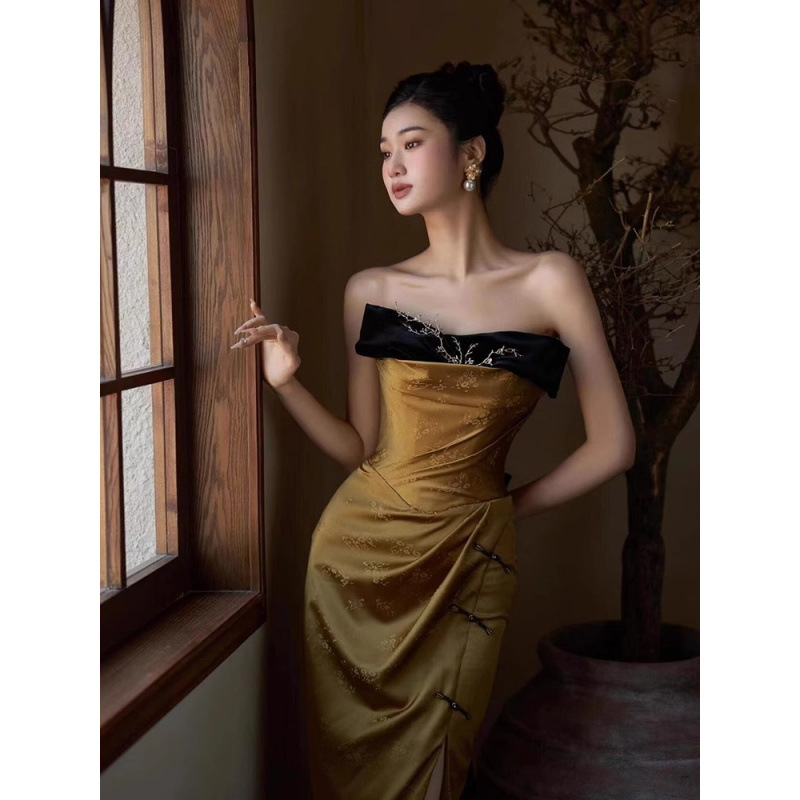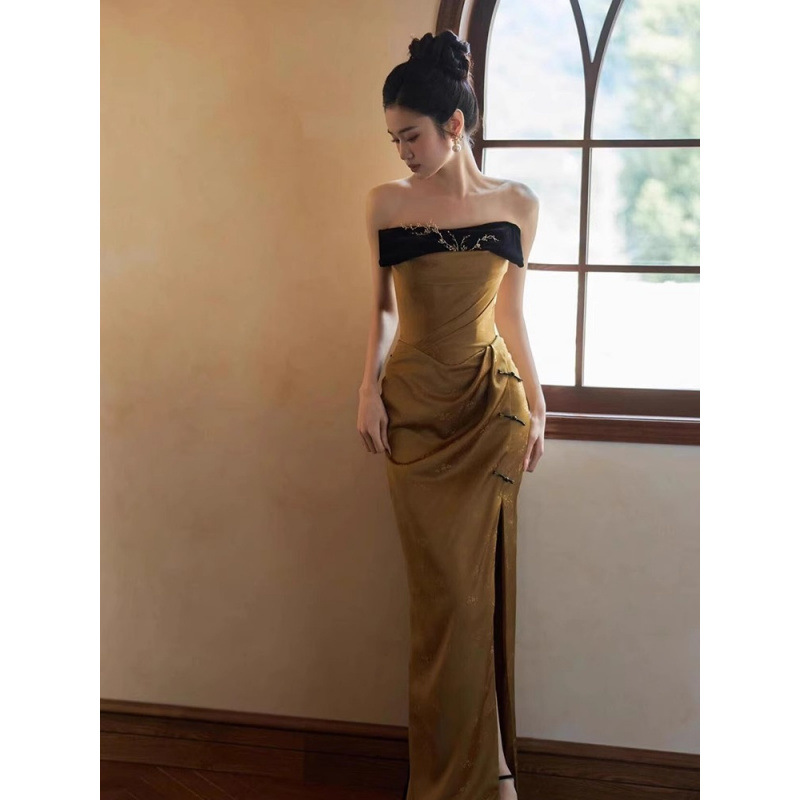 晨袍女新款高级感新中式抹胸敬酒服小众复古开衩新娘订婚礼裙