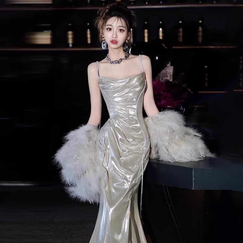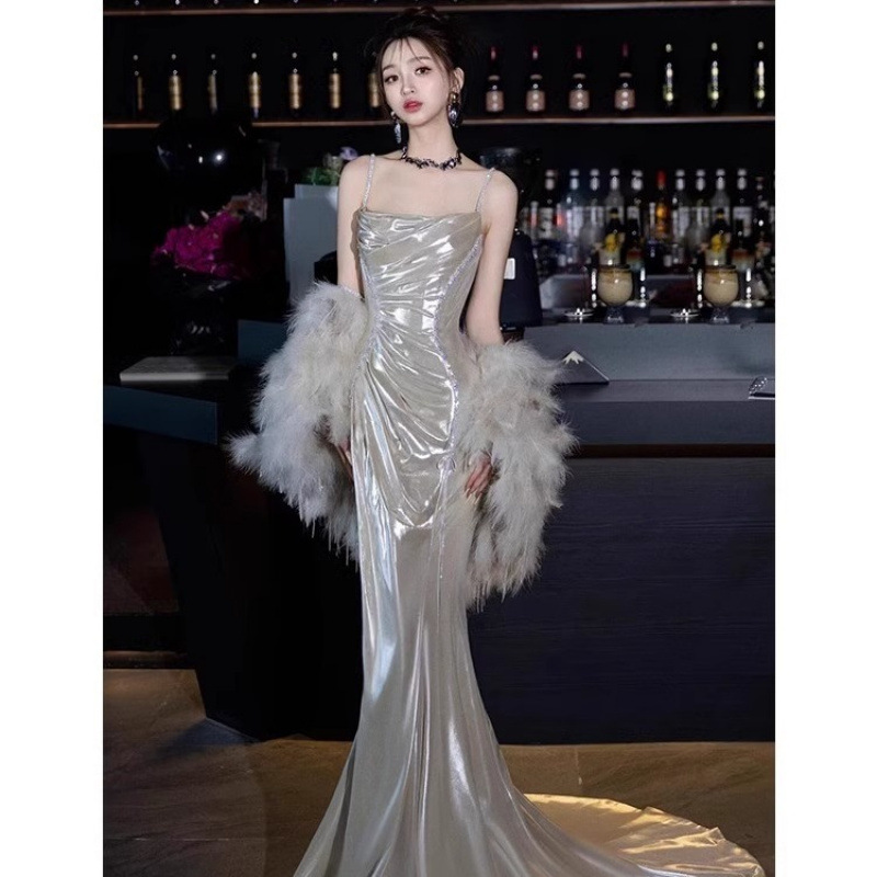 银色亮闪晚礼服晨袍新款高档感轻奢小众生日party吊带敬酒服