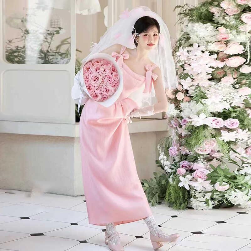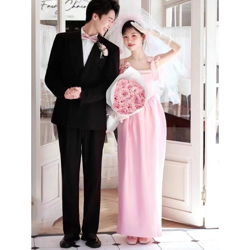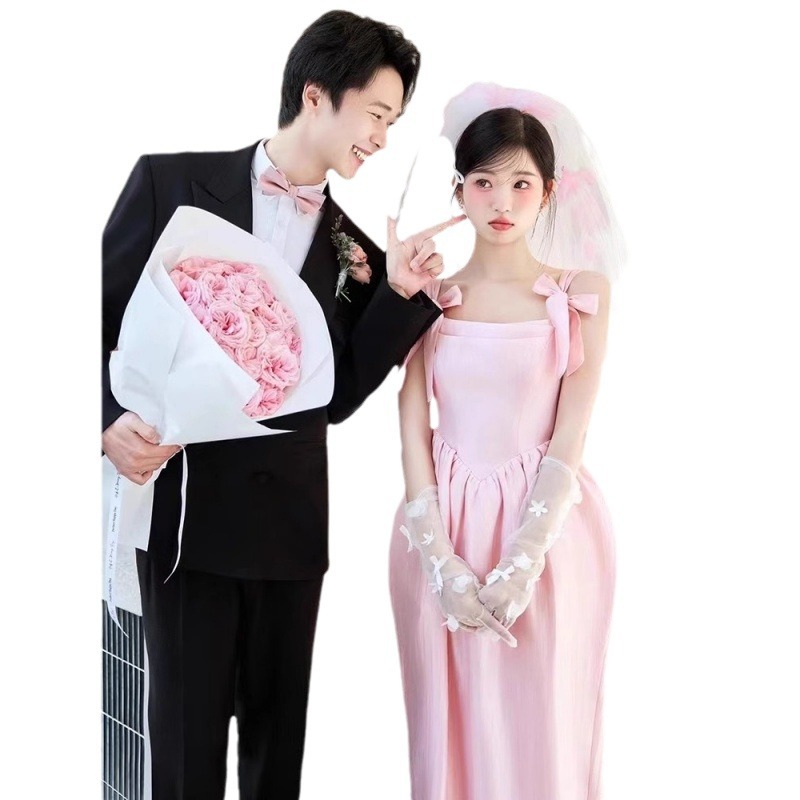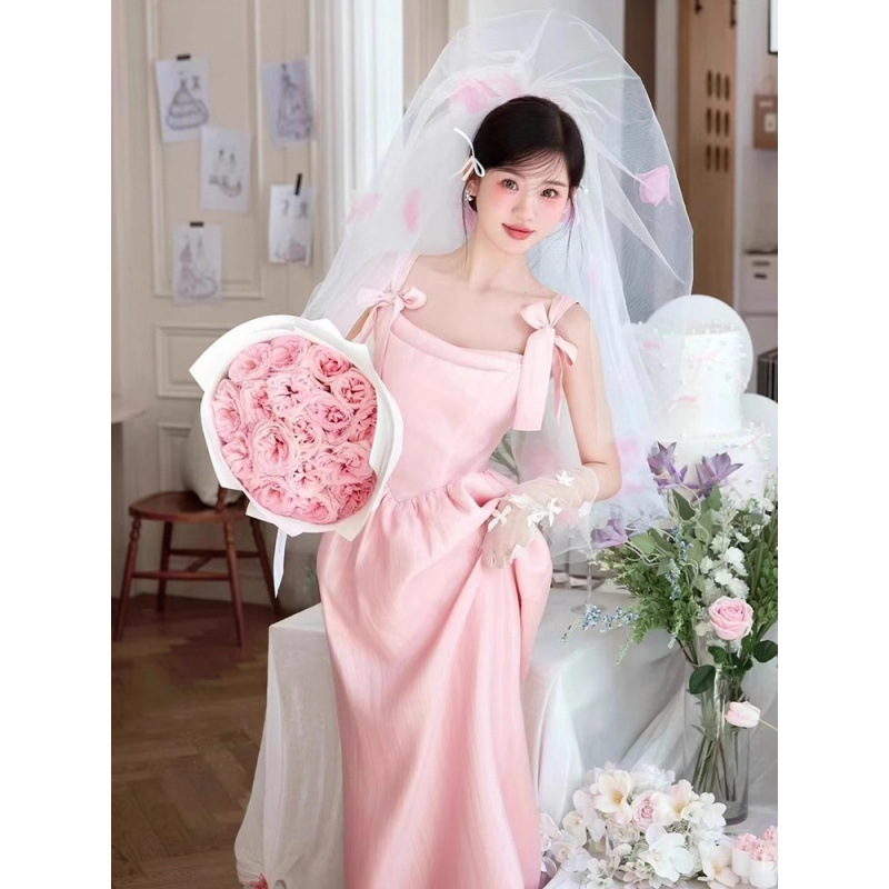 晨袍女新娘订婚晨拍礼服成人礼宴会粉色甜美小个子晚礼服领证裙子