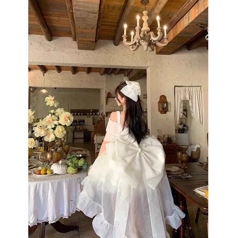 纯欲蝴蝶结吊带连衣裙收腰显瘦蓬蓬裙春夏短裙法式小黑裙女