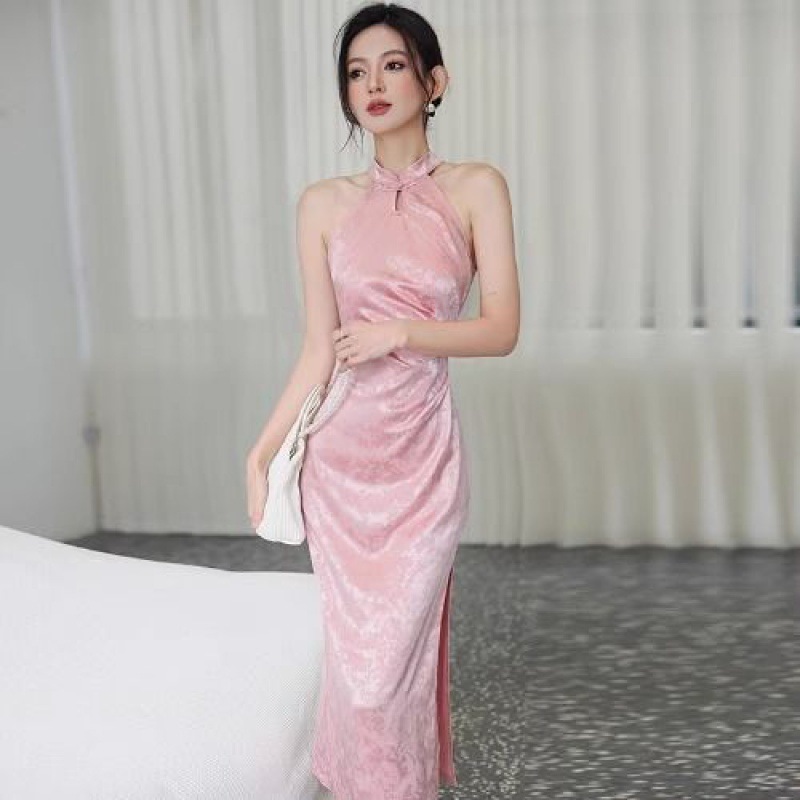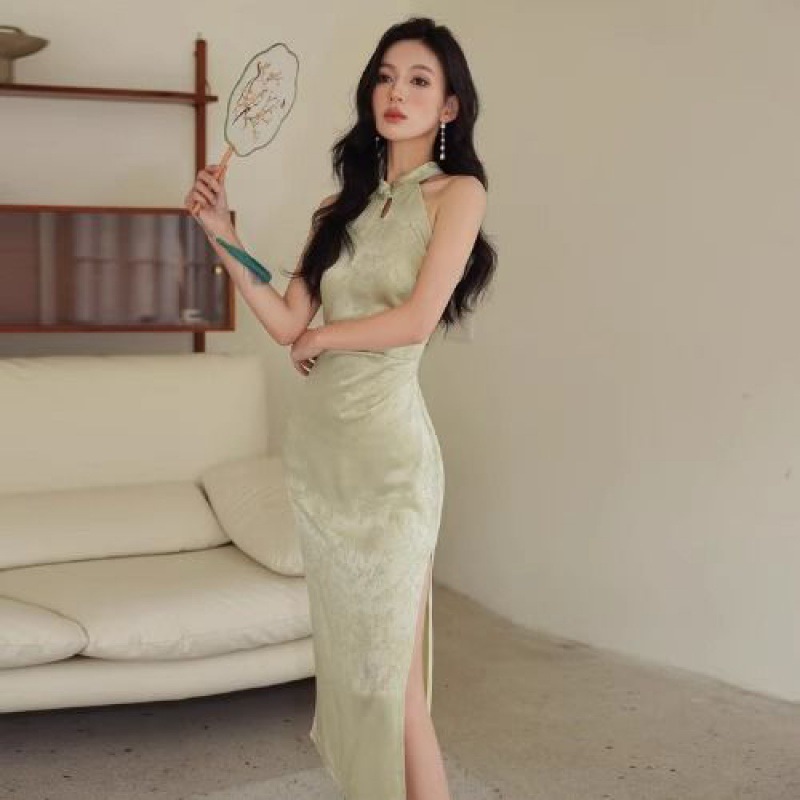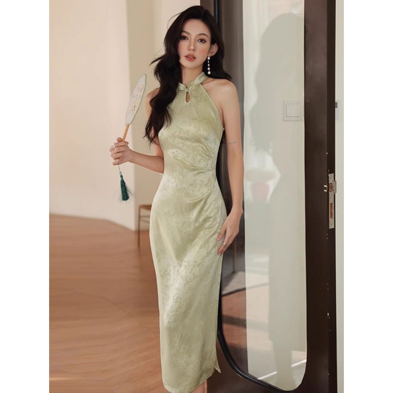 新中式温婉无袖挂脖改良旗袍连衣裙女复古提花盘扣开叉中长裙夏装