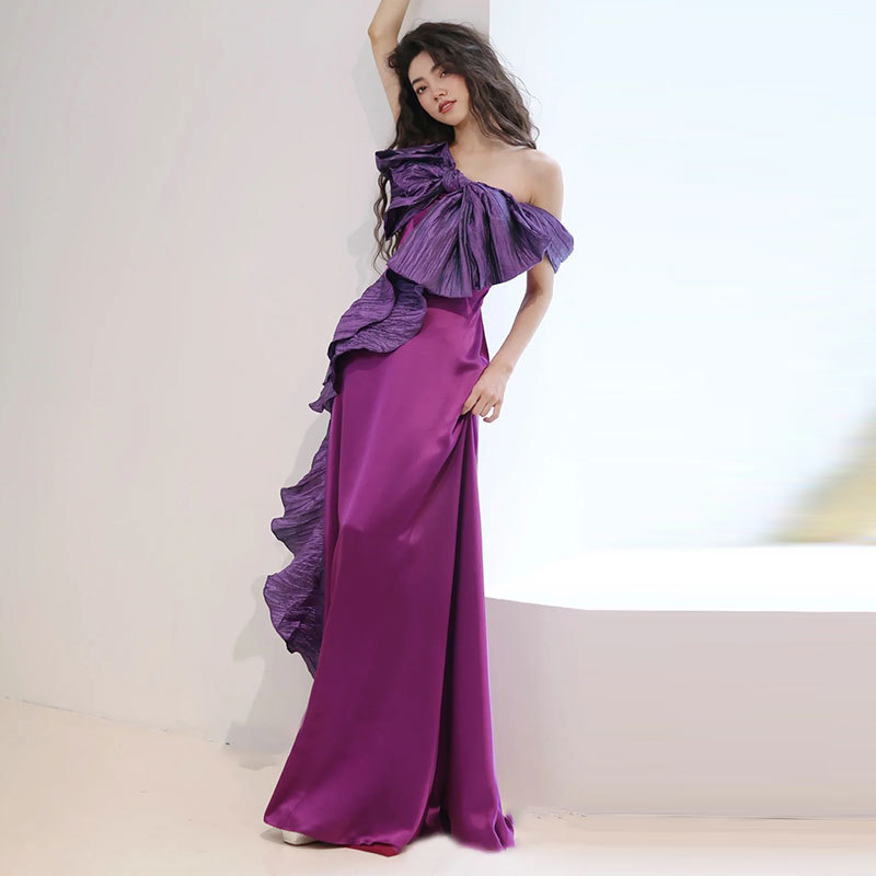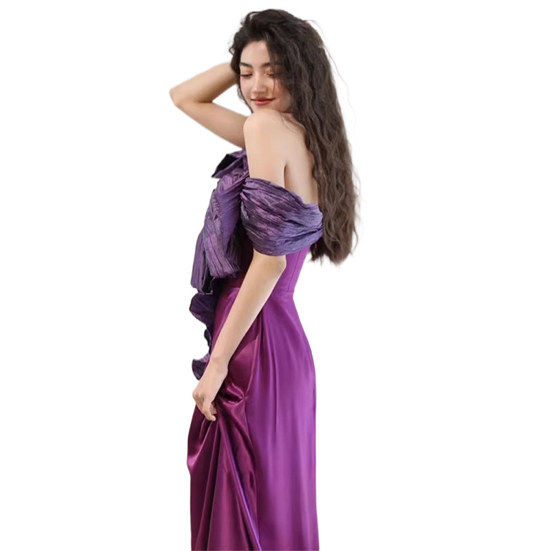 法式小众晨袍新款缎面新娘高级感敬酒服订婚晚礼服连衣裙紫色