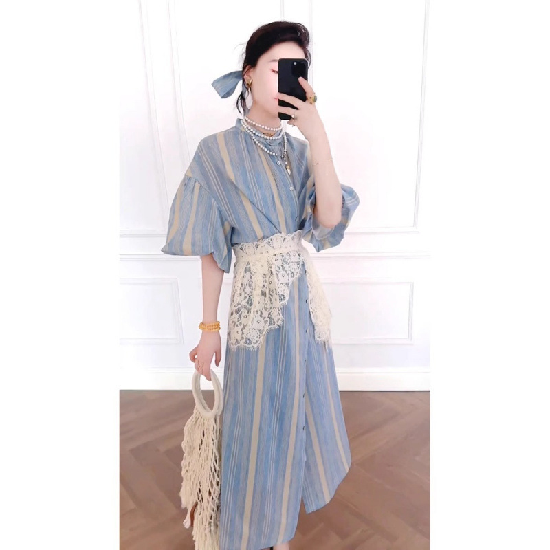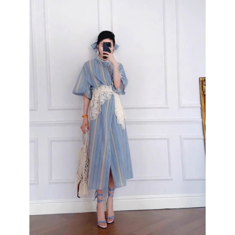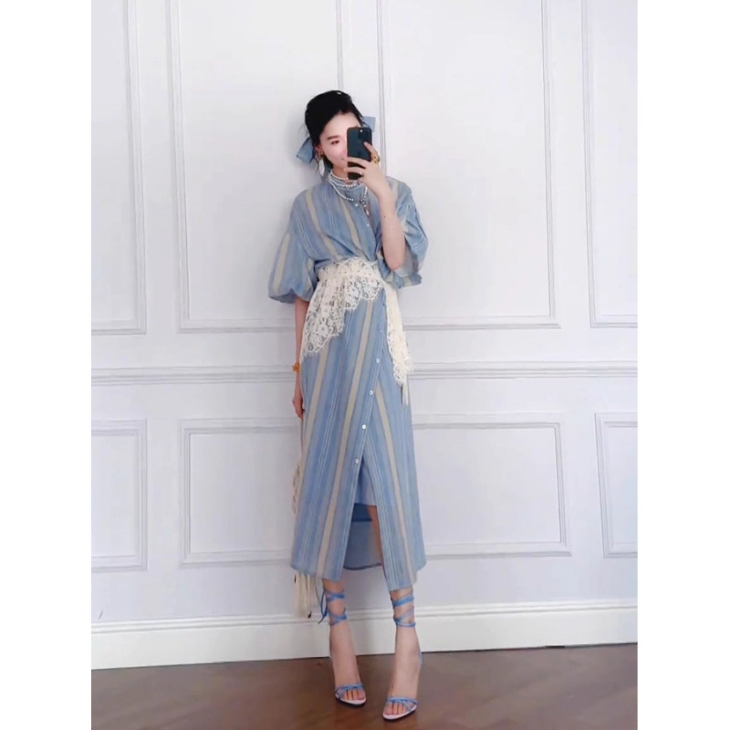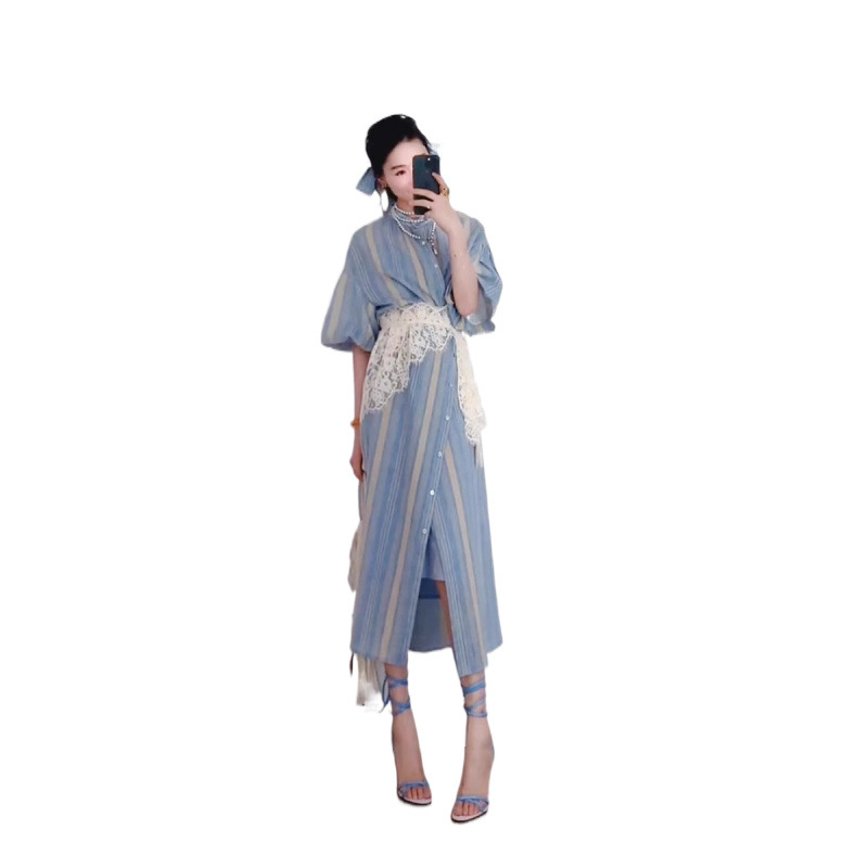 高档感蓝色条纹衬衫裙套装女春秋轻奢复古长裙蕾丝束腰两件套