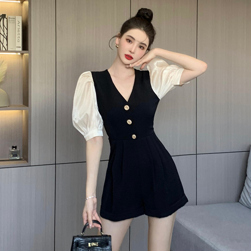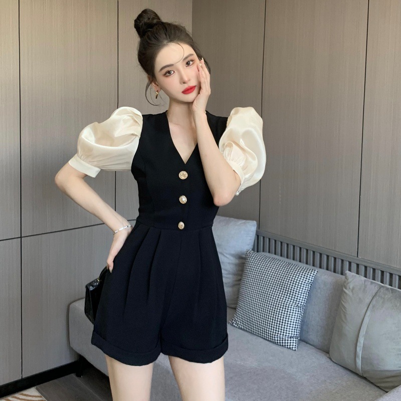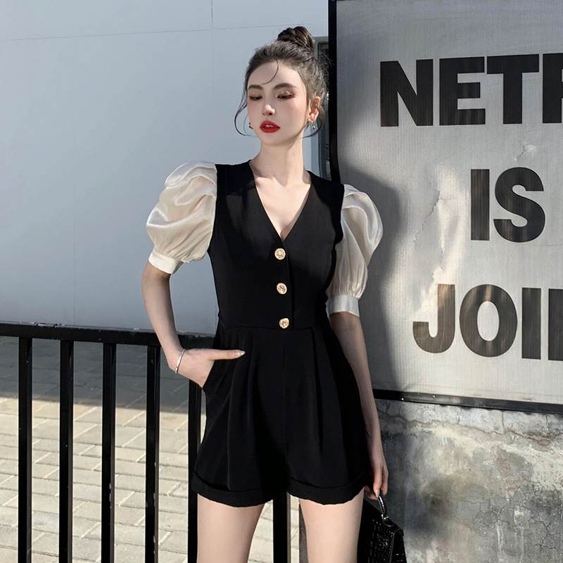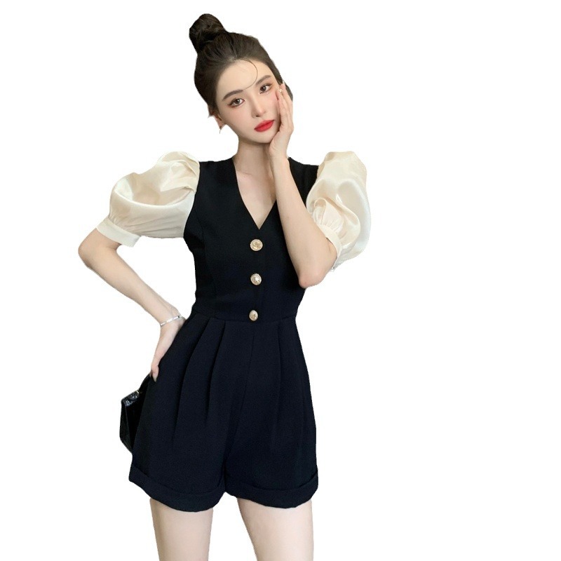 法式小众黑色气质V领连体裤女夏季新款泡泡袖设计感时尚连衣裤