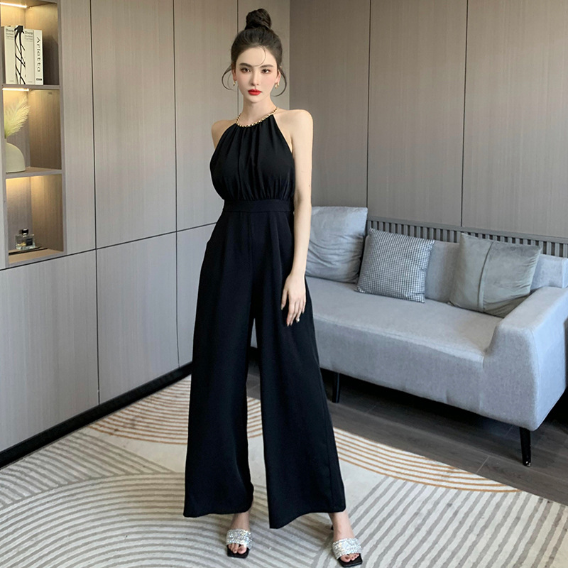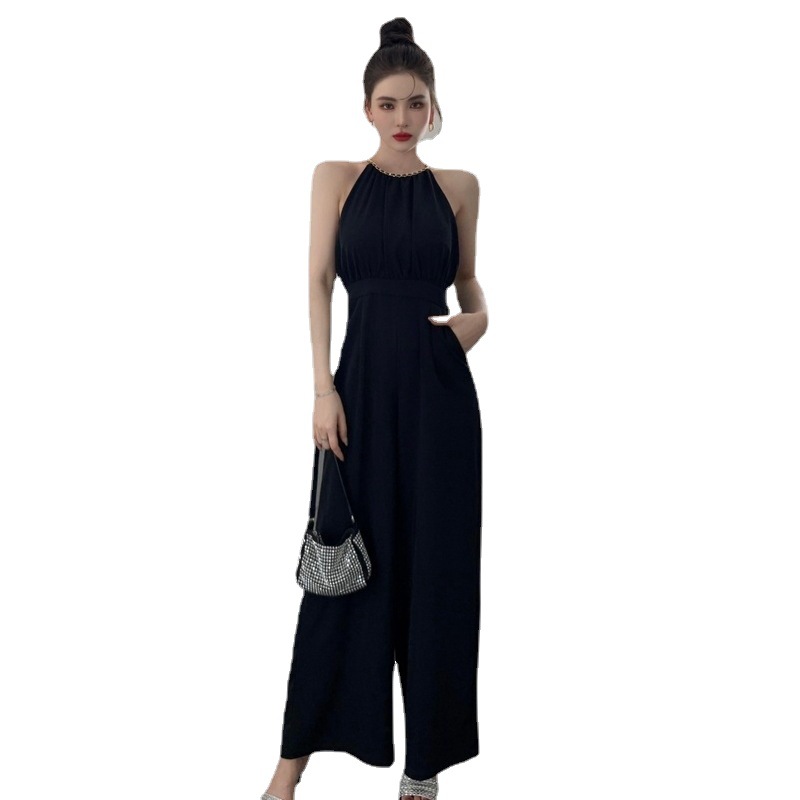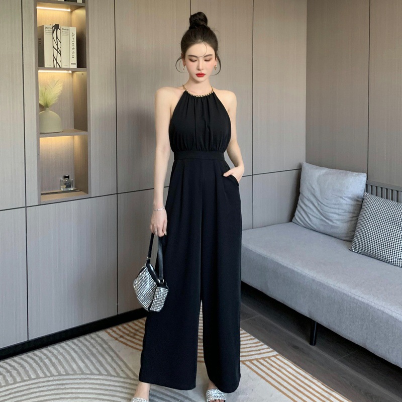 实拍夏季新款小香黑金链条挂脖连体裤女黑色显腿长阔腿长裤连衣裤
