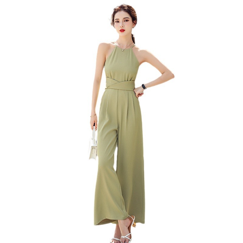 实拍 系带高腰坠感连衣裤夏季新款显白大长腿复古优雅挂脖连体裤