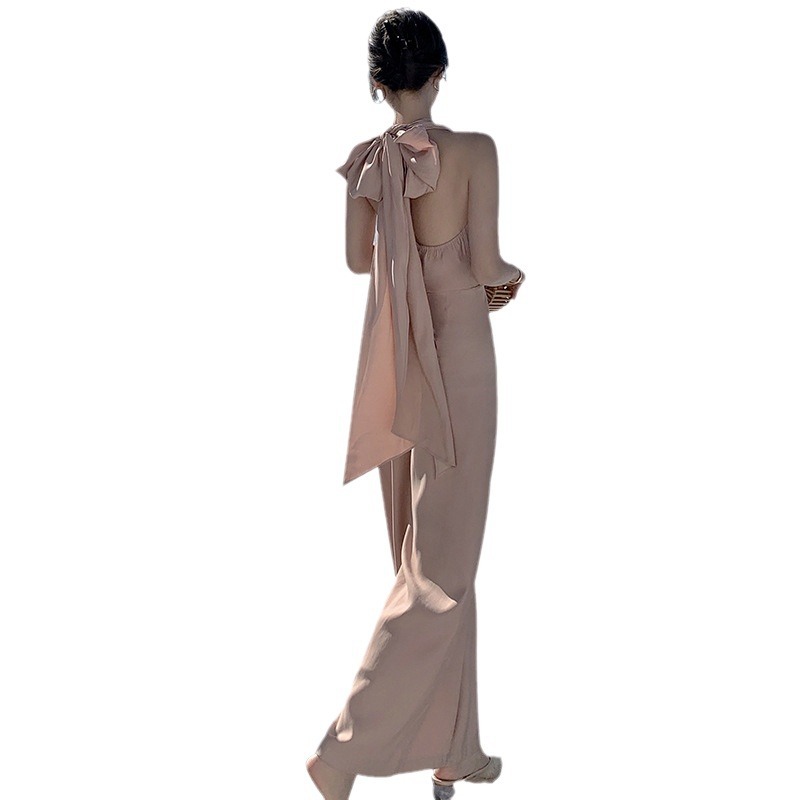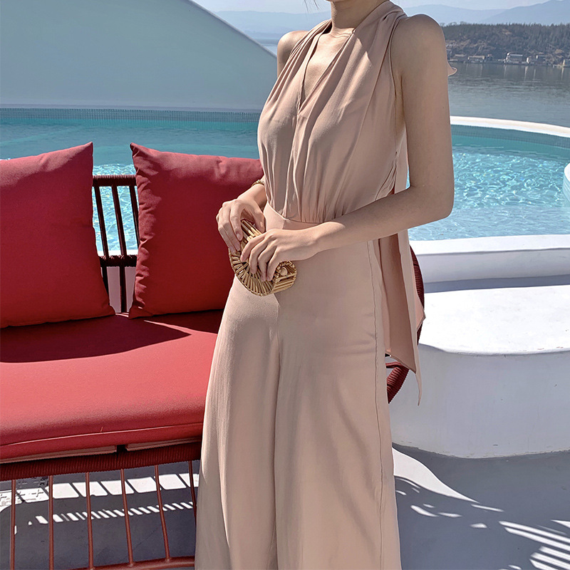 春夏三亚海边度假风V领挂脖露背阔腿连体裤女名媛气质连体长裤子