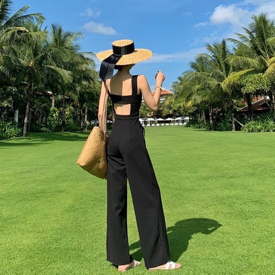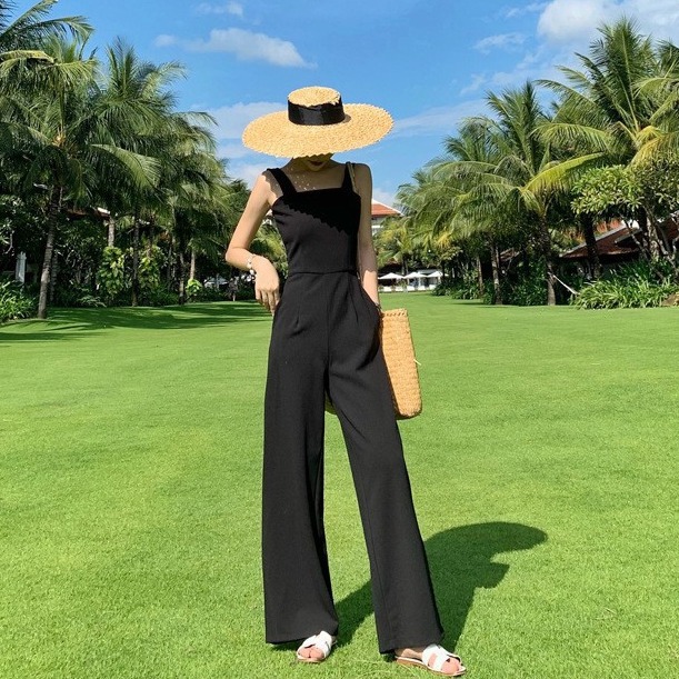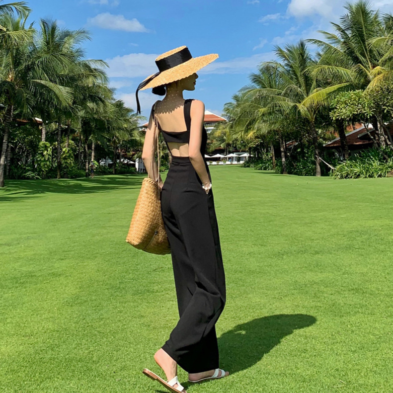 夏季新款度假连体裤女阔腿裤套装显瘦宽松气质高腰时尚黑色背带裤