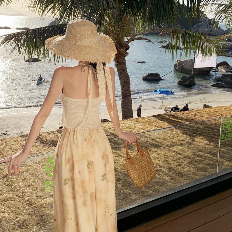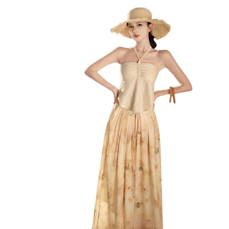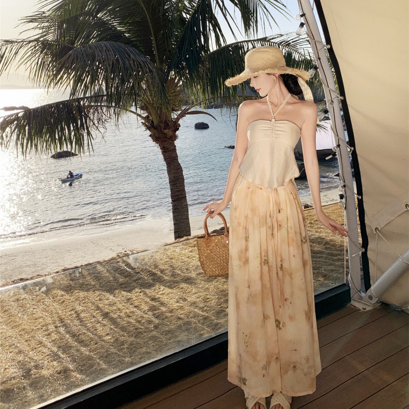 枯山水~水墨碎花垂感褶皱松紧腰阔腿裤+清冷感挂脖抹胸吊带套装女