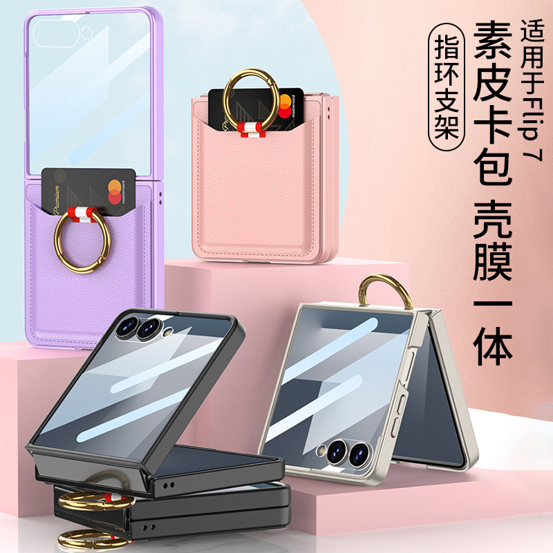 适用三星ZFlip7手机壳超薄卡包指环壳膜一体全包素皮防摔保护套