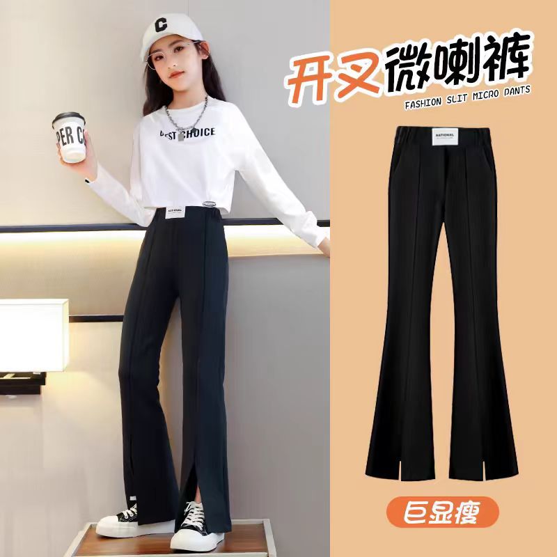 儿童棉质裤子新款女大童开叉喇叭裤黑色小女孩洋气时髦春秋装