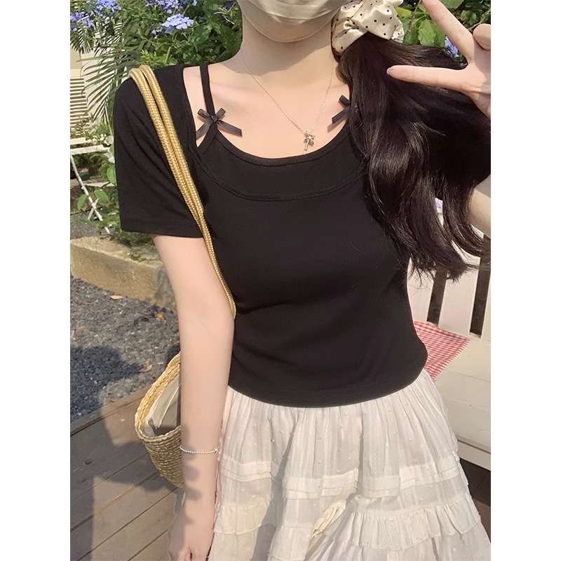 韩版甜美纯欲风圆领蝴蝶结夏季新款短袖T恤女假两件修身纯色上衣