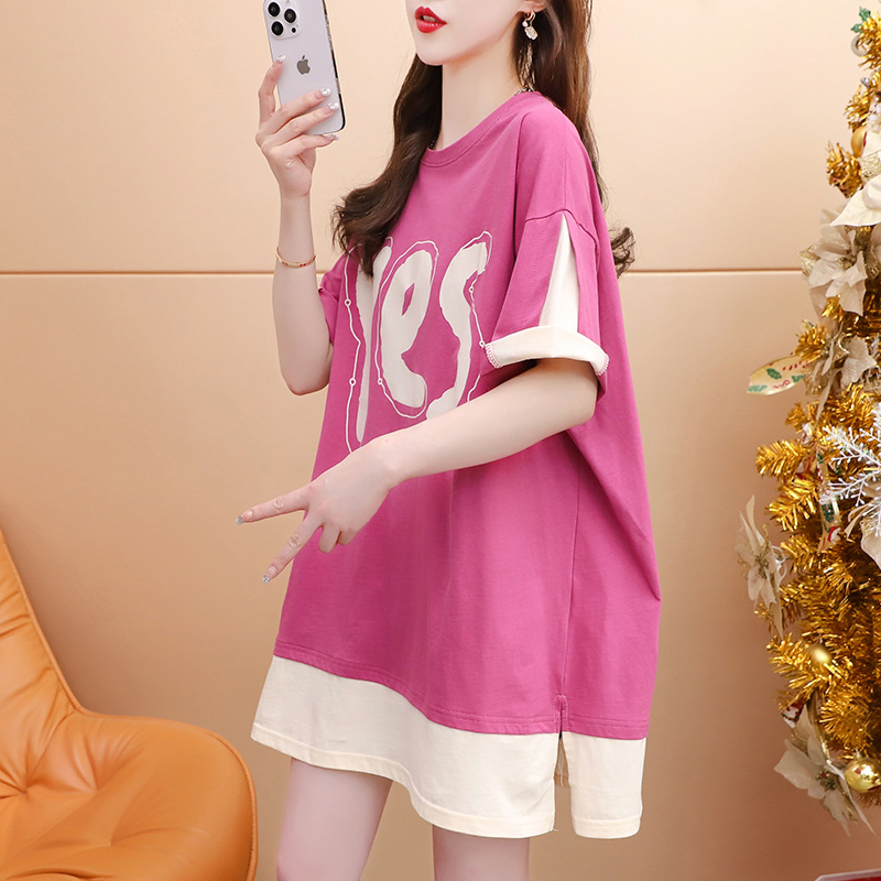 后包领特大码胖mm中长款印花拼色短袖假两件t恤女
