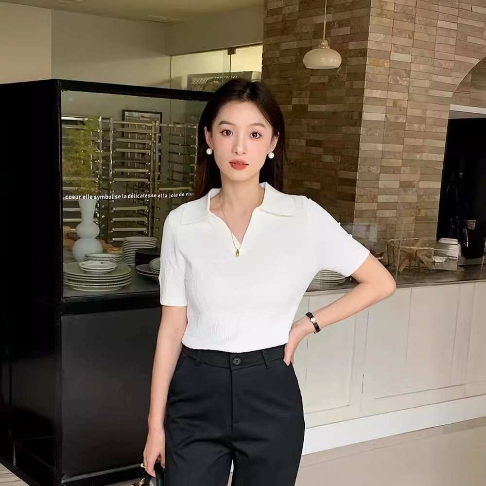 包邮 冰凉质感透气修身法式polo衫套头短袖针织上衣T恤女夏季