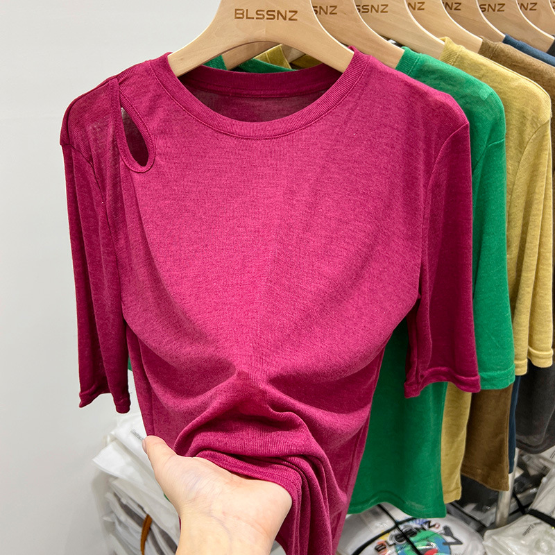 欧货冰丝面膜短袖t恤女ins潮宽松夏季镂空露肩薄款上衣设计感小众