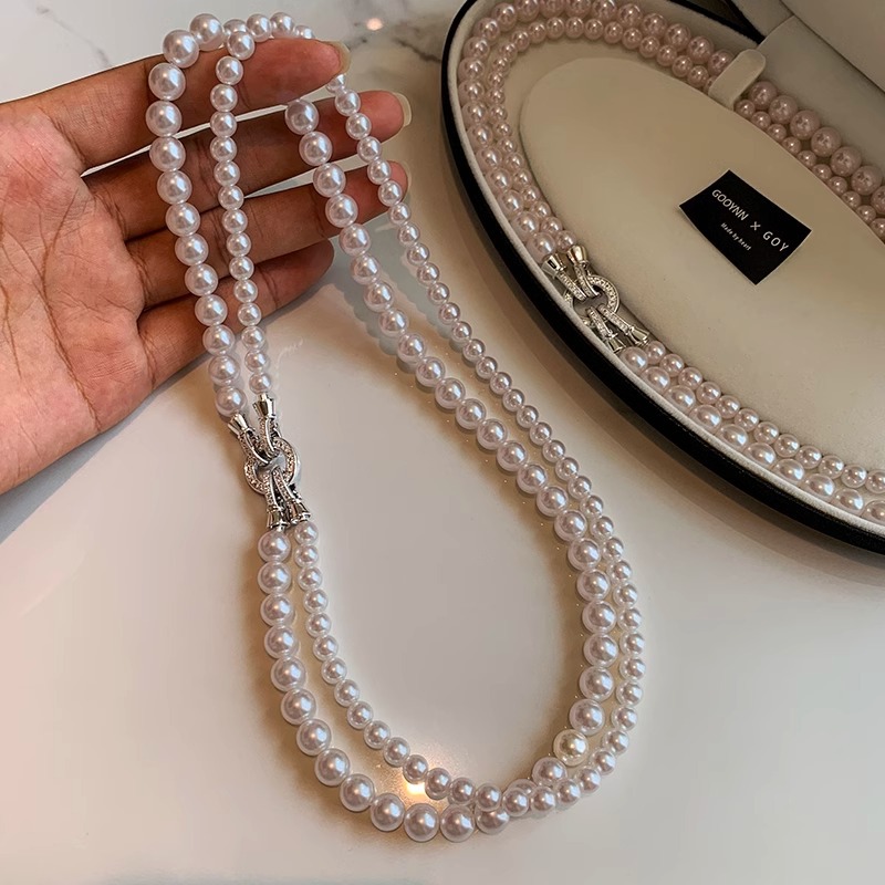 施家双层叠戴珍珠项链女轻奢小众高级大气锁骨颈链新款毛衣链
