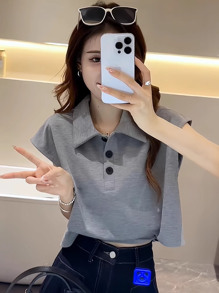 灰色POLO领小飞袖t恤女2025新款爆款夏季小众设计感宽松显瘦上衣
