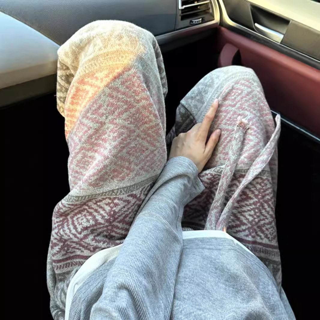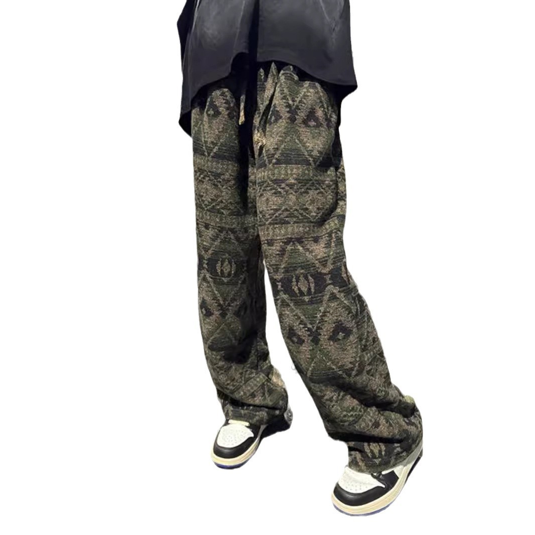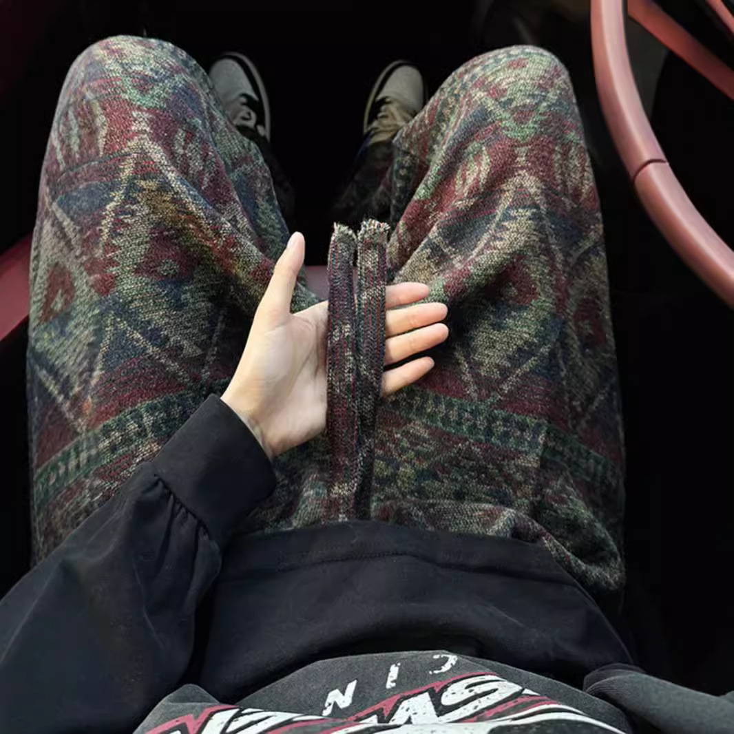 针织脏脏风裤子男款秋冬季民族风提花阔腿裤vintage美式休闲长裤