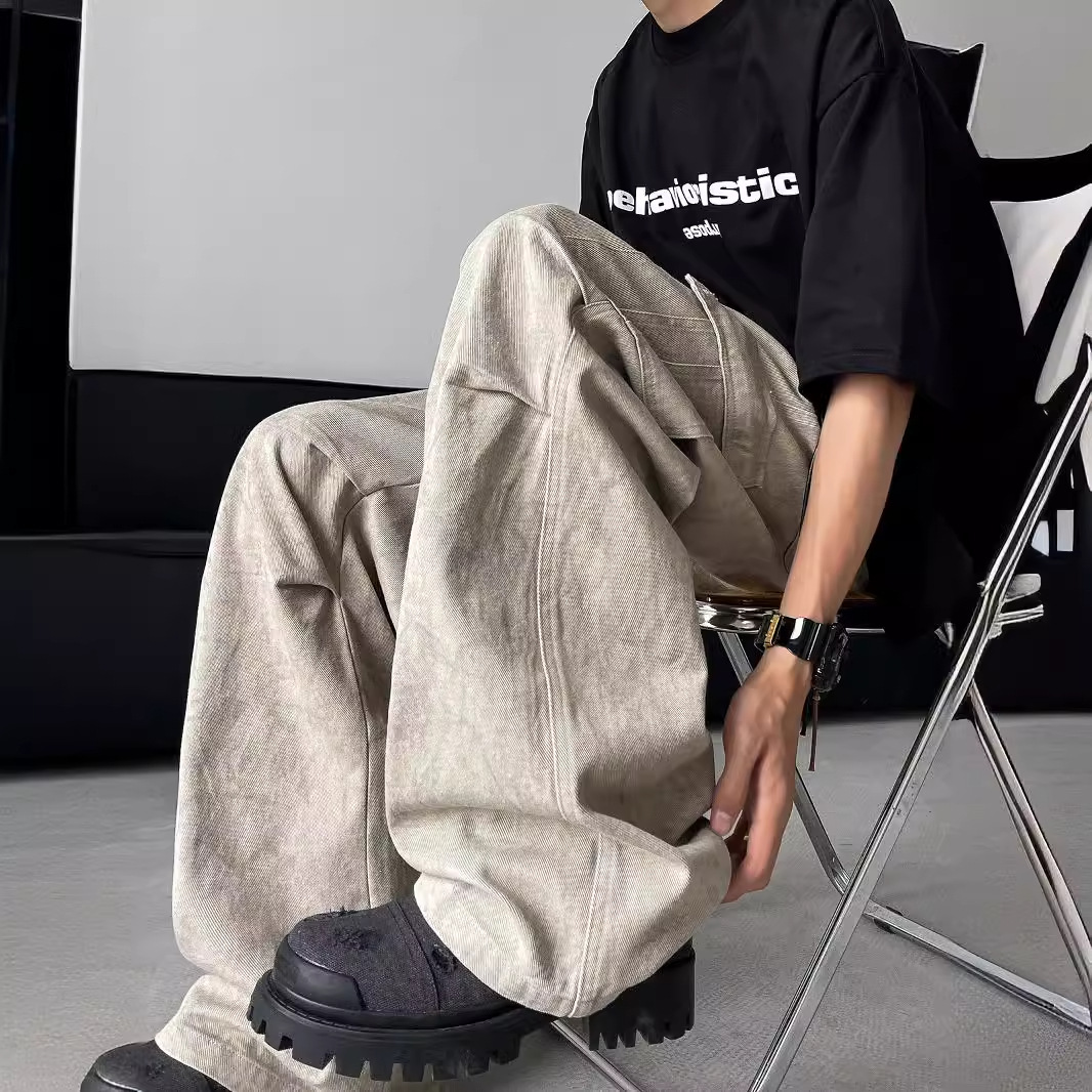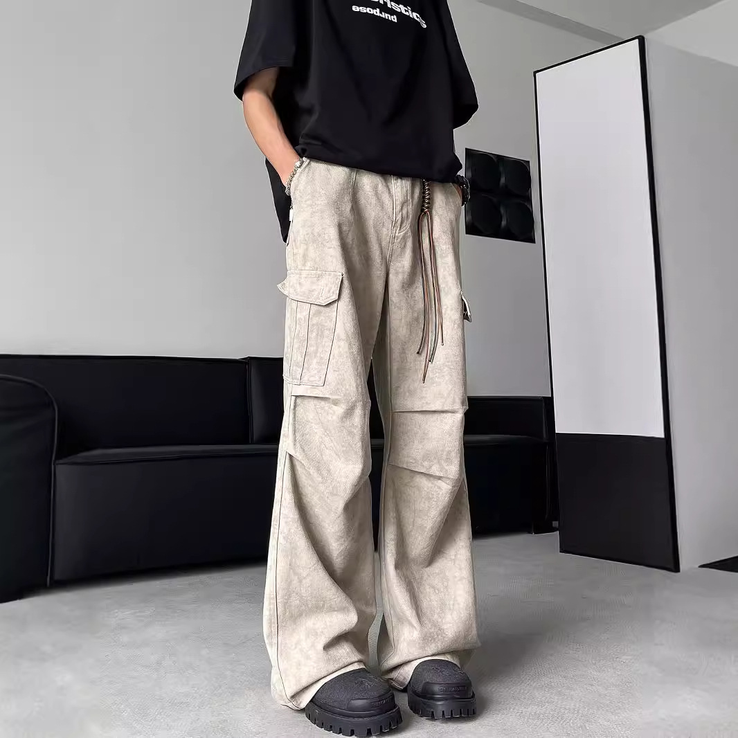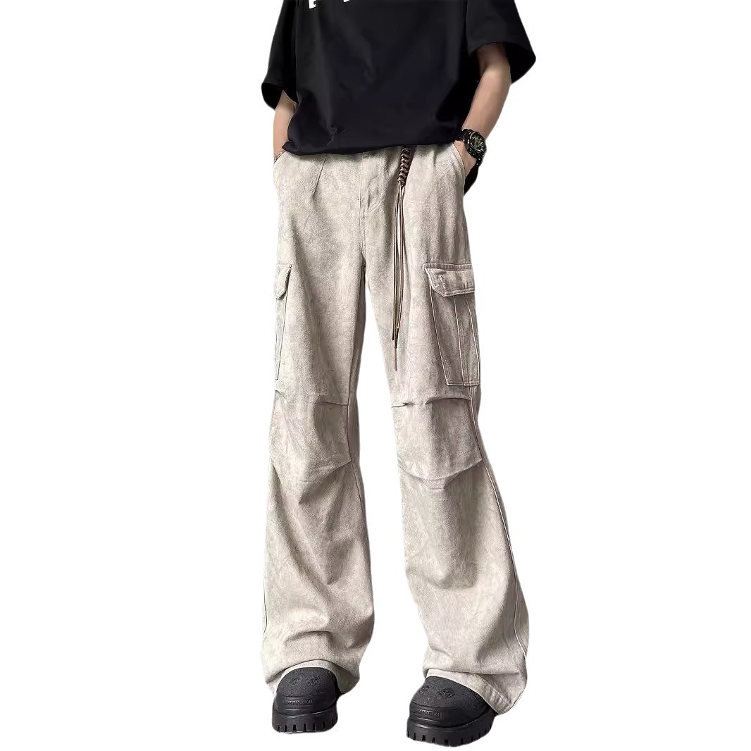美式复古Cargo伞兵裤男潮牌高街大口袋宽松休闲暗纹工装阔腿长裤
