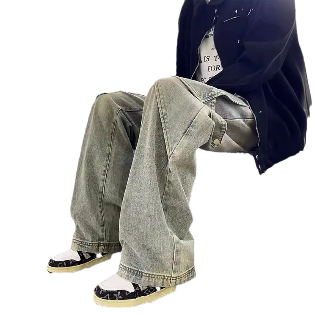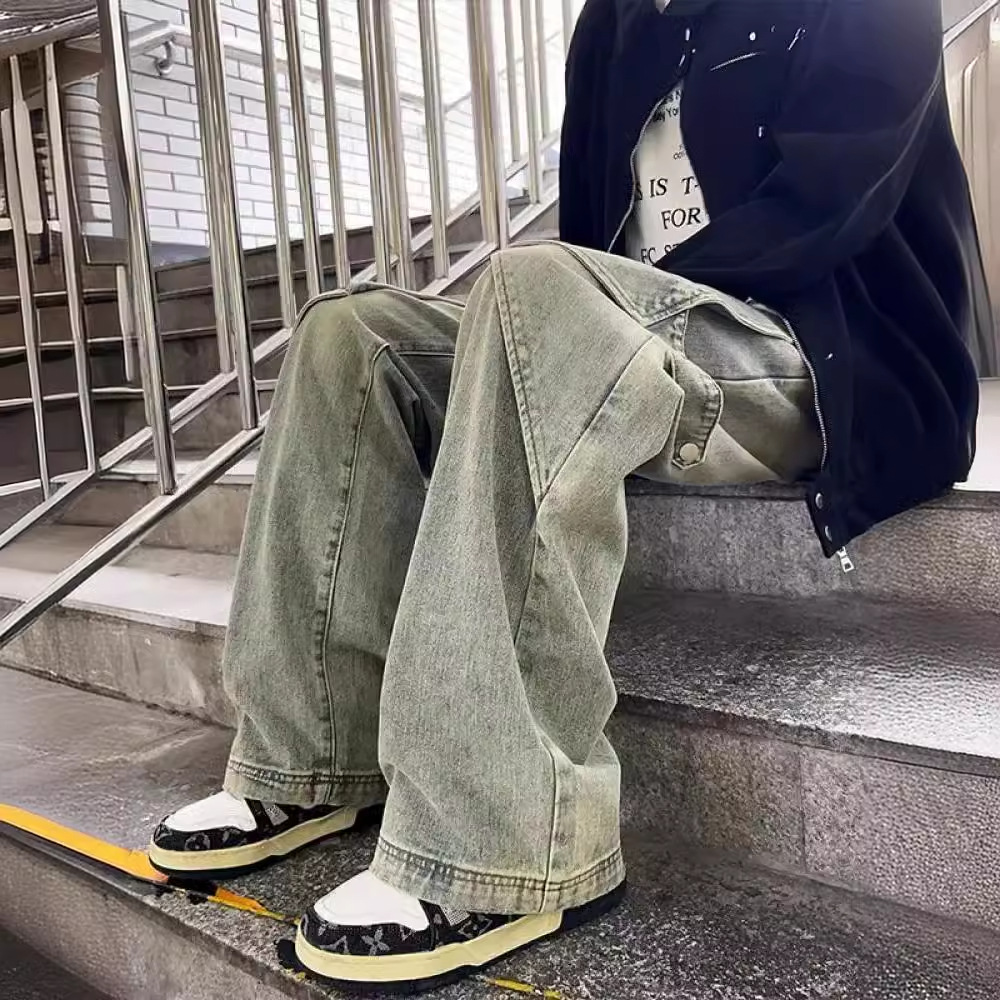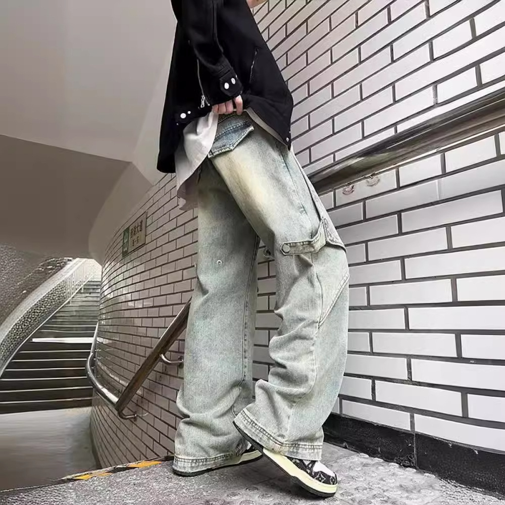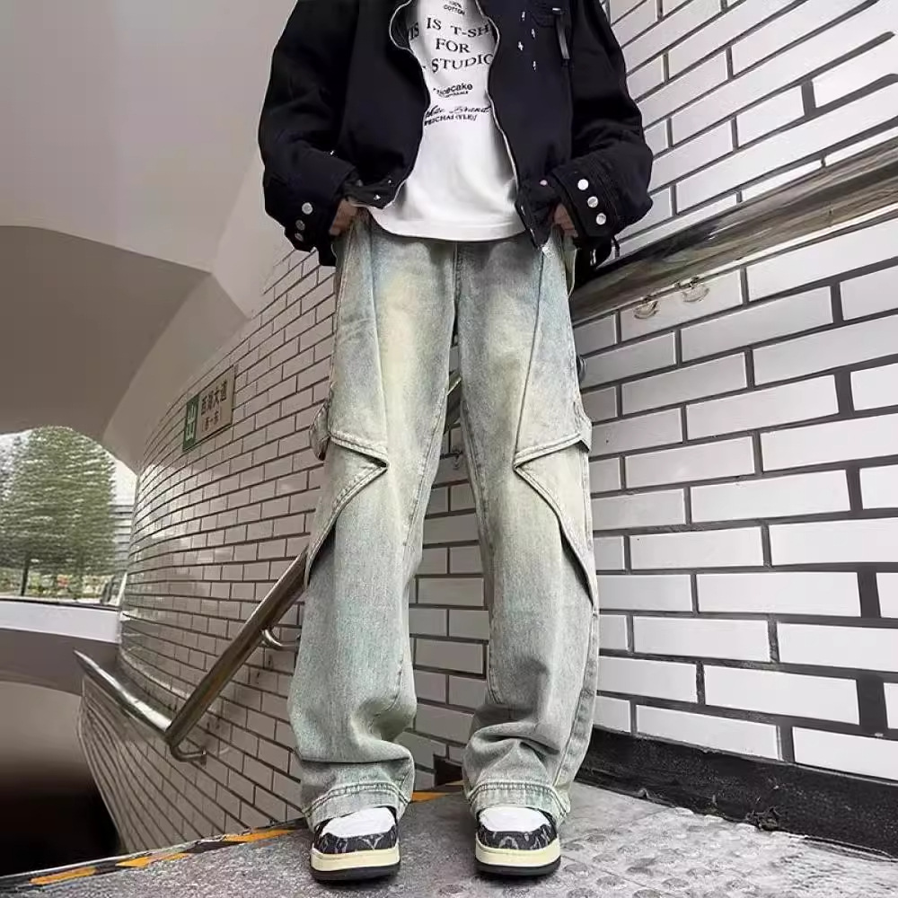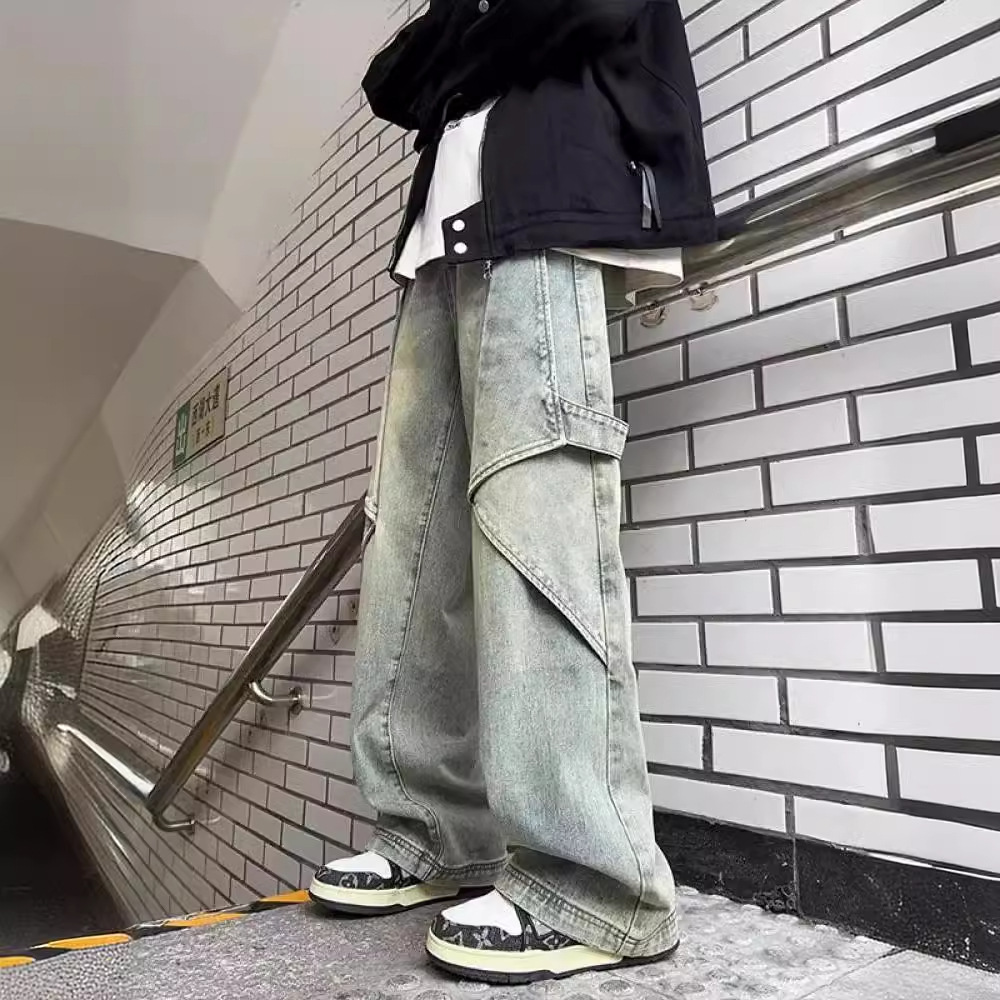黄泥工装牛仔裤男款高街美式复古解构阔腿裤子vibe风垂感直筒长裤