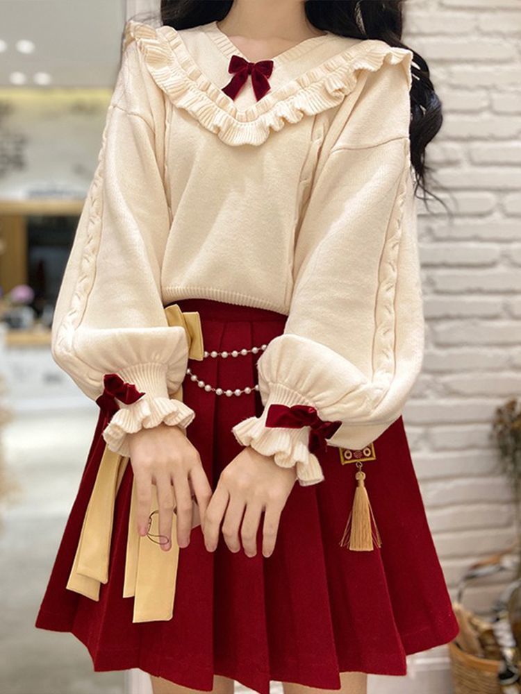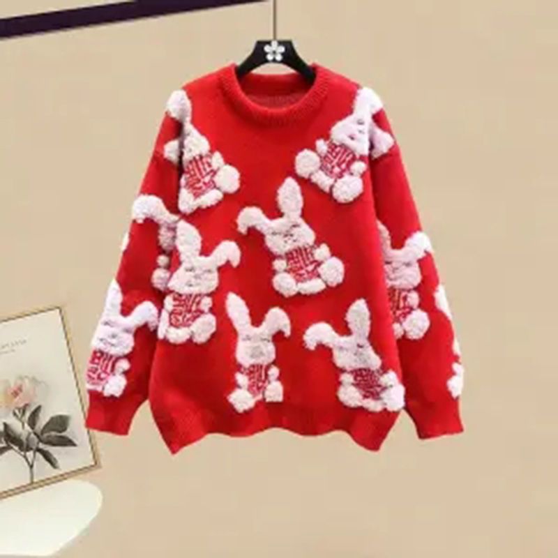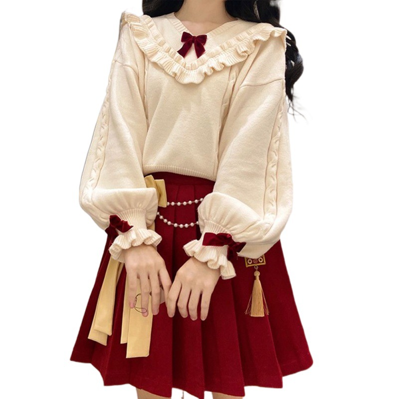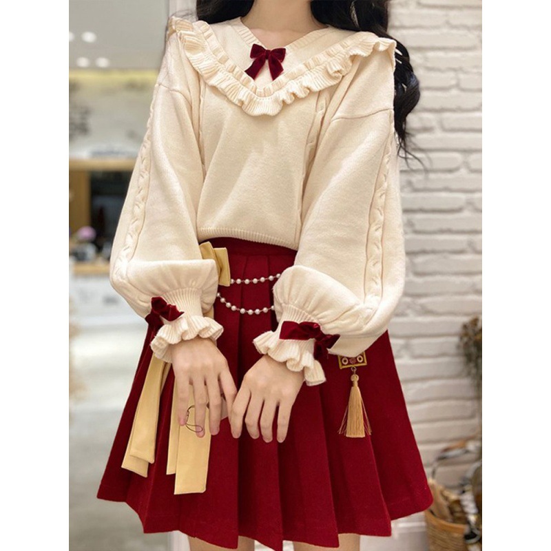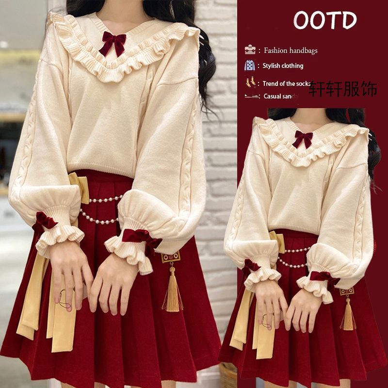 套装裙一整套宽松红色本命年毛衣百褶短裙两件套