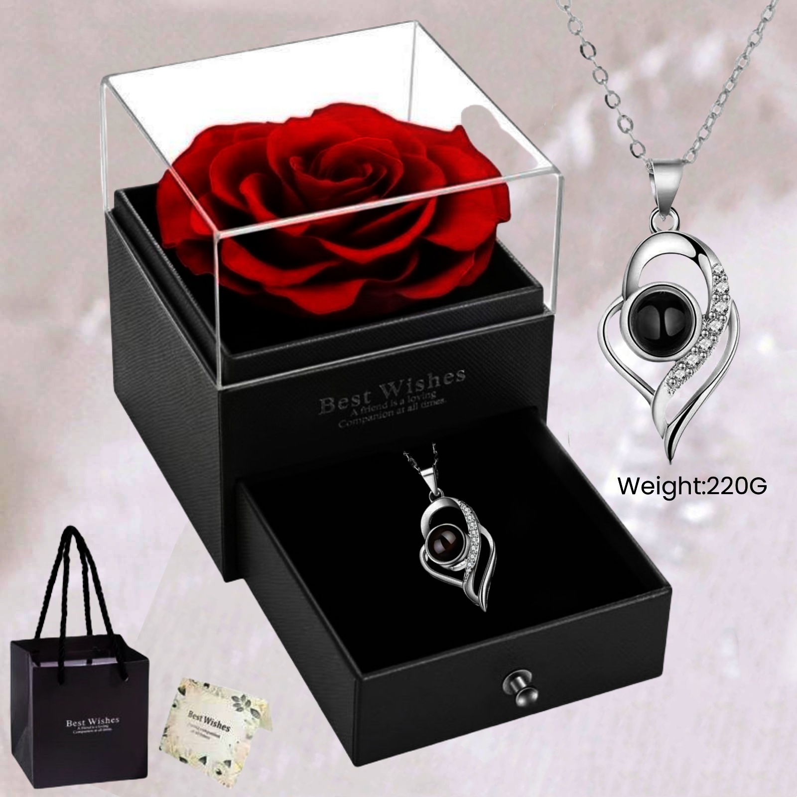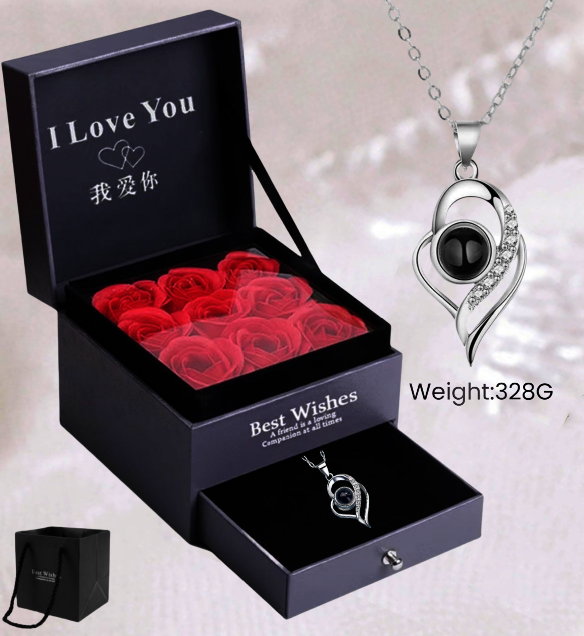 白金色柔美爱心语言项链+9朵玫瑰礼盒